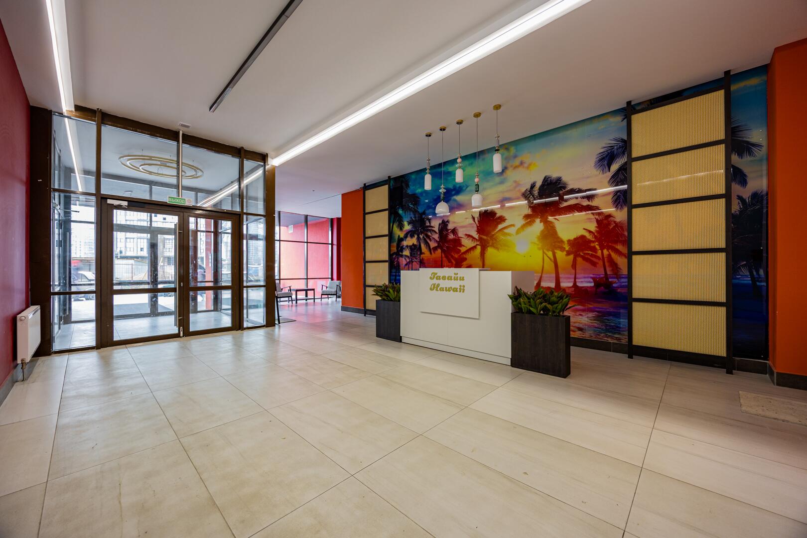 Уютное атмосферное лобби, стойка консьержа, зона отдыха для гостей, гостевой санузел, сквозной подъезд.