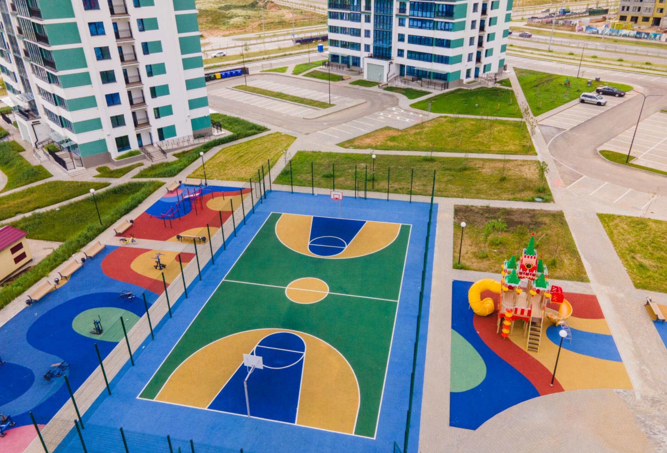 спортивная арена, велодорожки по всему комплексу, теннисные площадки, волейбольные и баскетбольные площадки.