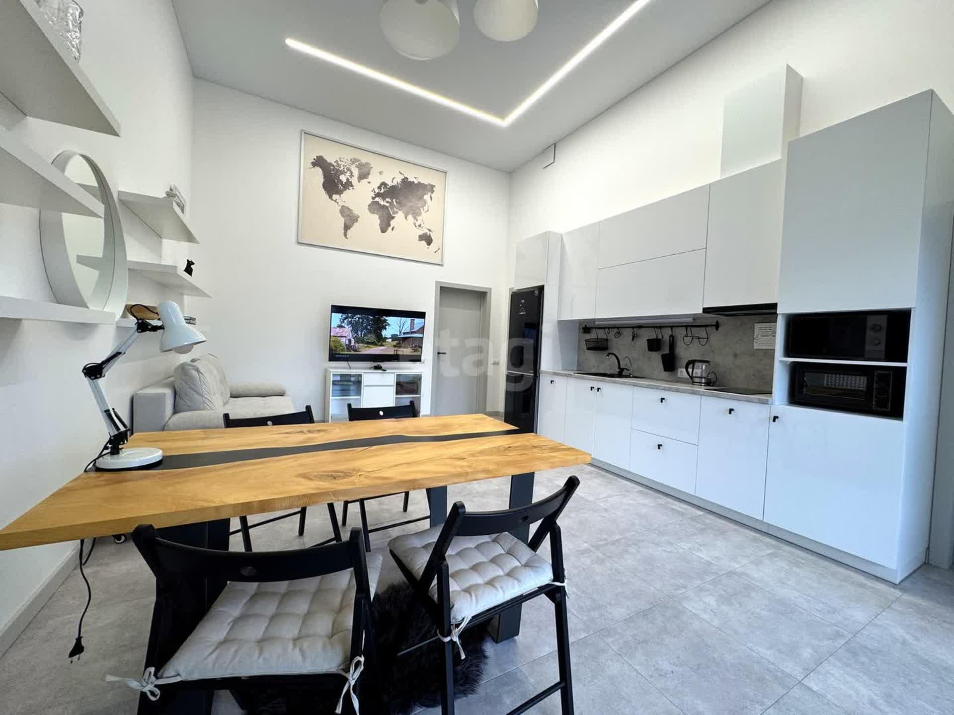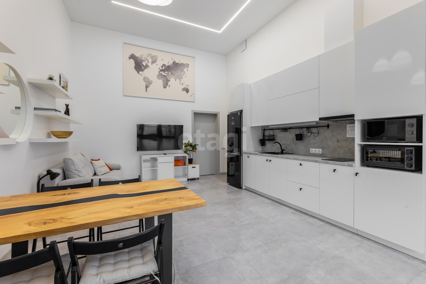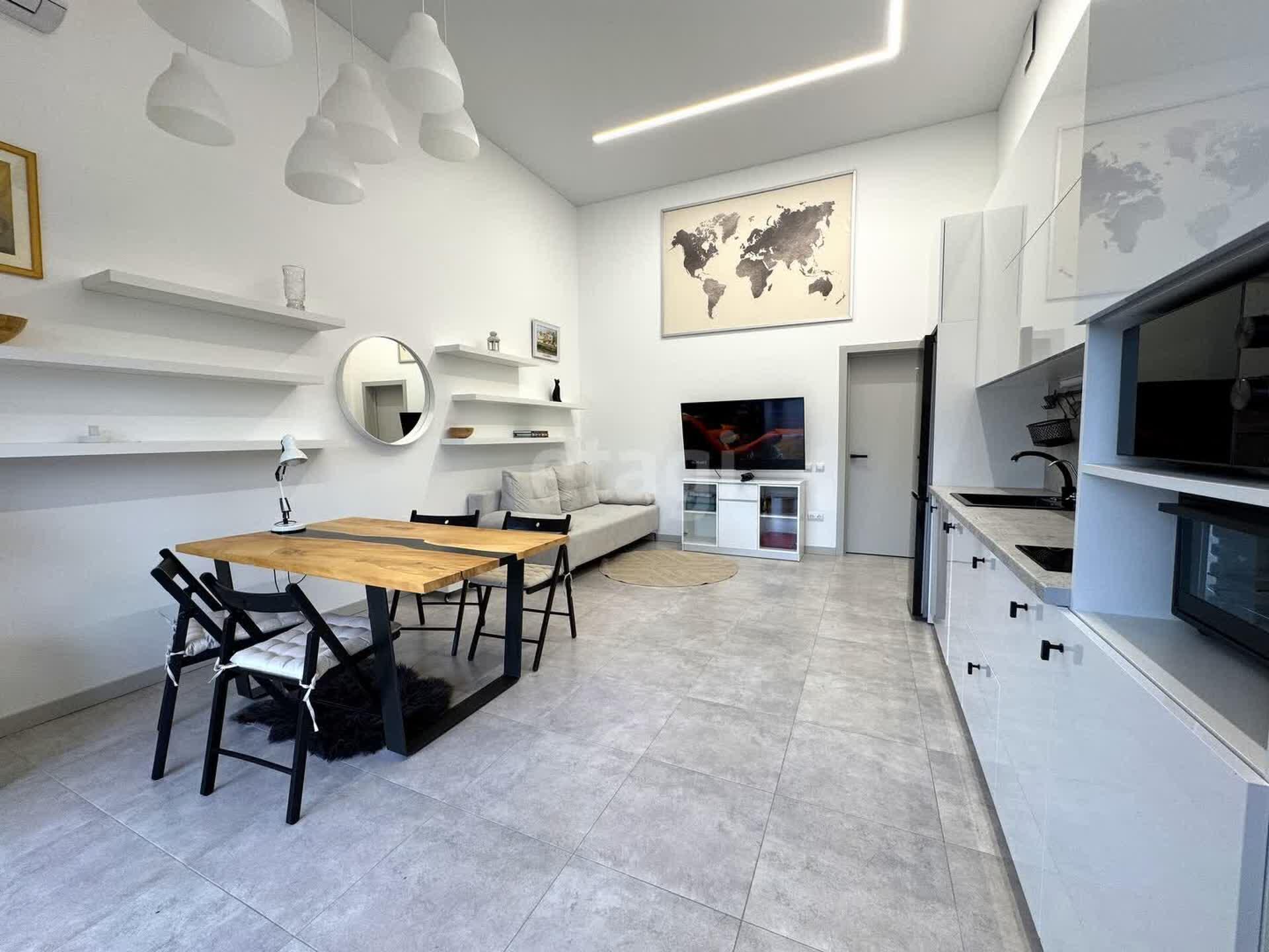 Гостиная-кухня с высокими четырехметровыми потолками и многоуровневым освещением создана для комфортного времяпрепровождения. Здесь вы найдете уютный диван-кровать, большой телевизор, дизайнерский обеденный стол и полностью оборудованную кухню с современной техникой.