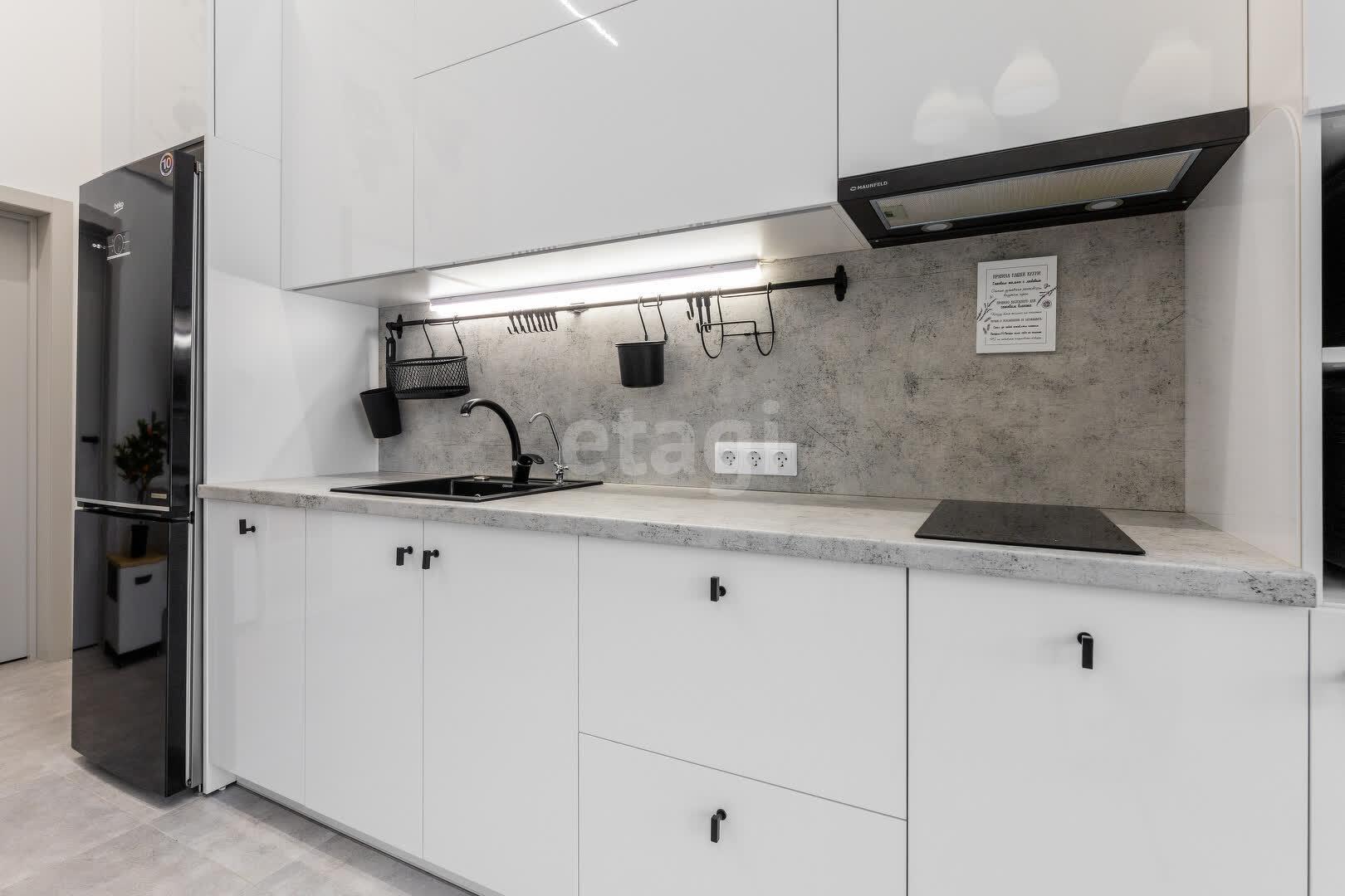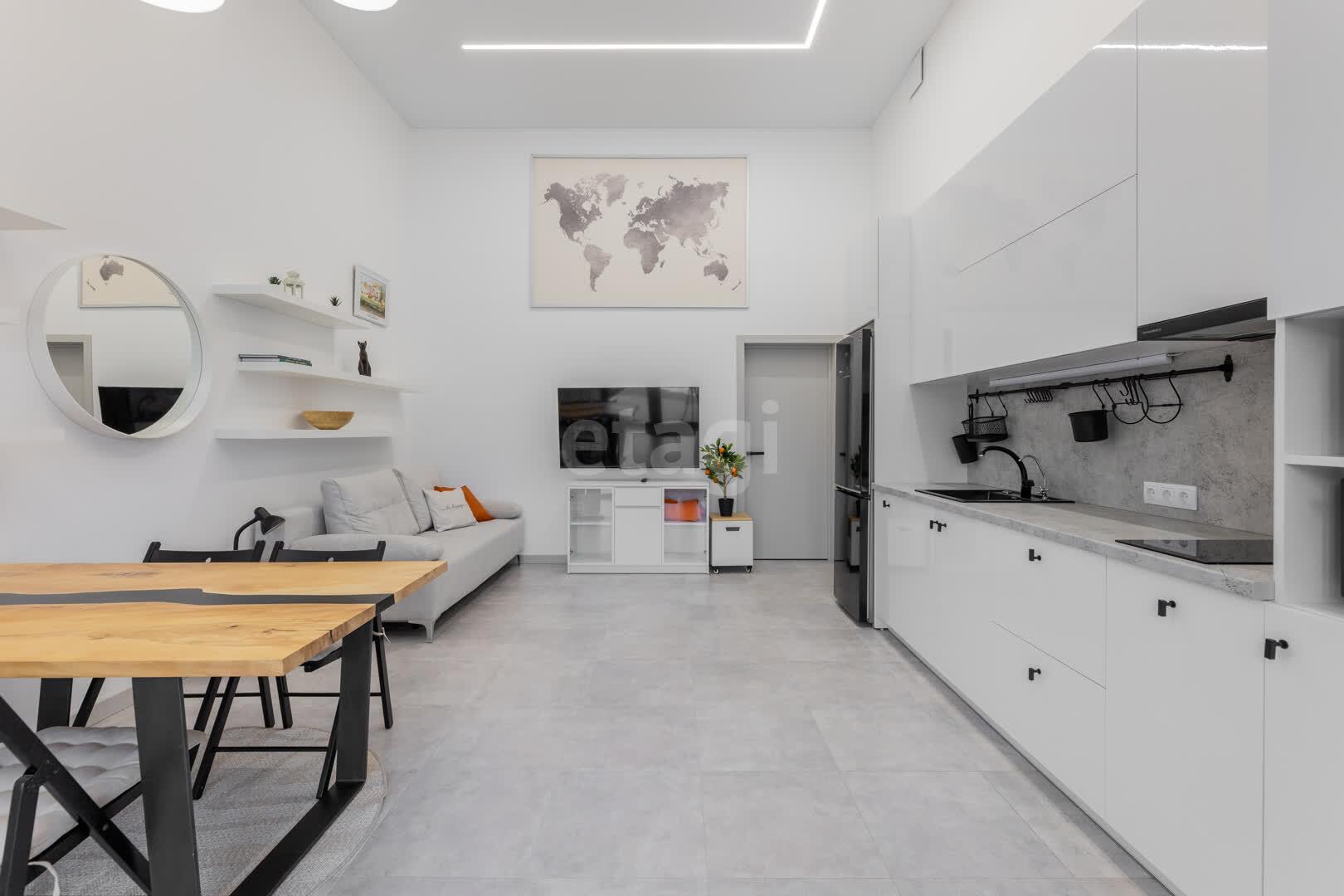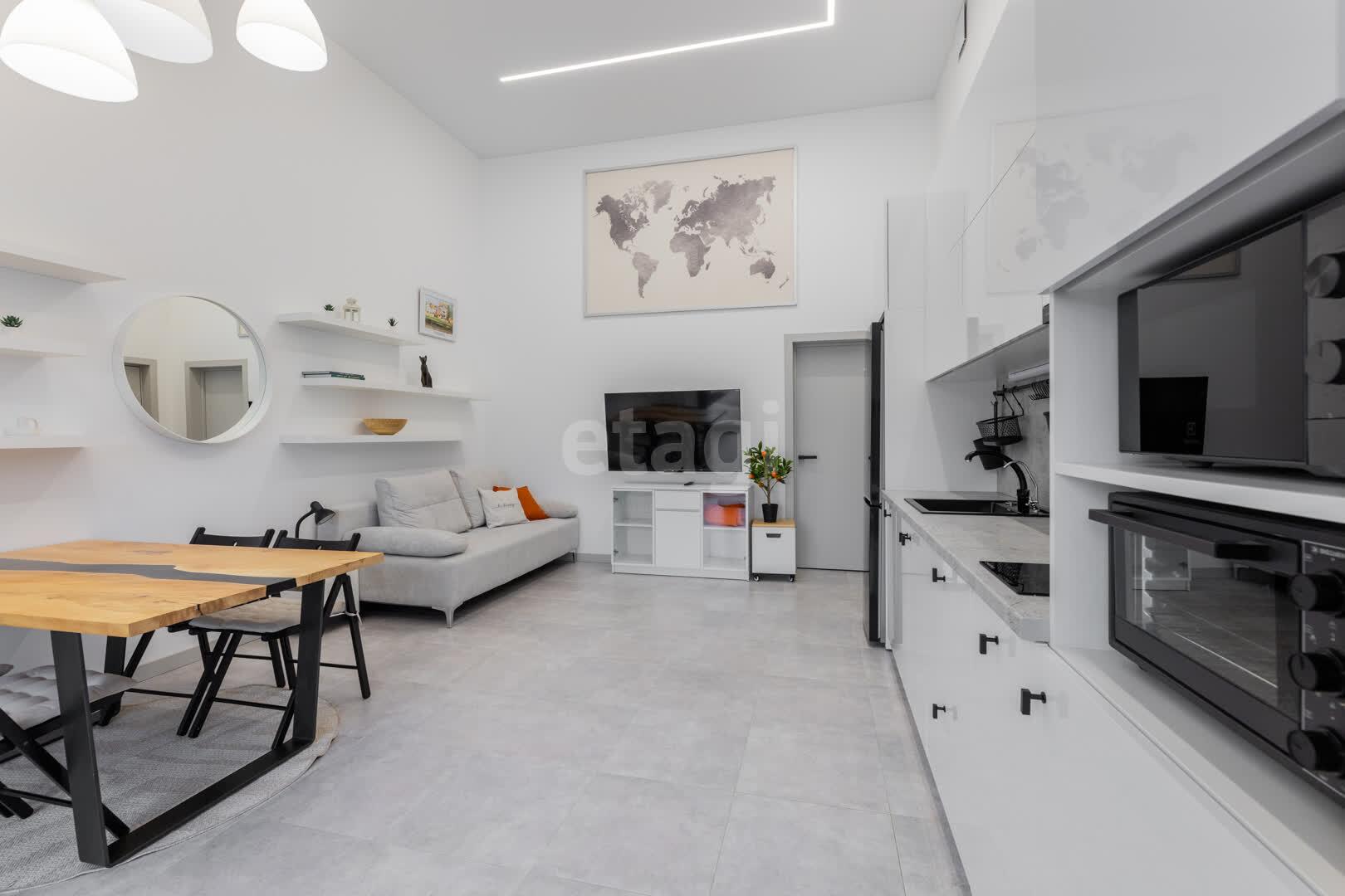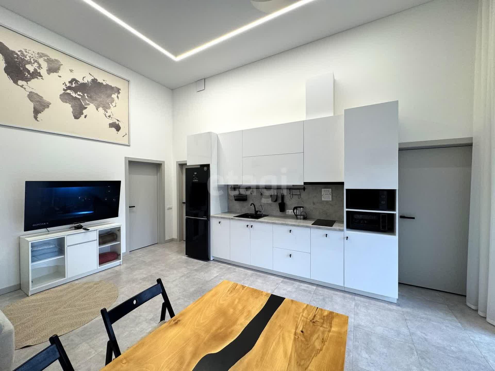 Гостиная-кухня с высокими четырехметровыми потолками и многоуровневым освещением создана для комфортного времяпрепровождения. Здесь вы найдете уютный диван-кровать, большой телевизор, дизайнерский обеденный стол и полностью оборудованную кухню с современной техникой.