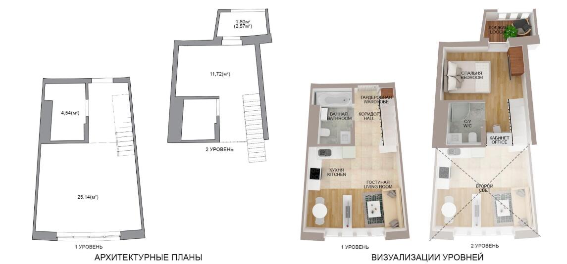 · Каждая квартира имеет 2 уровня - антресольный этаж