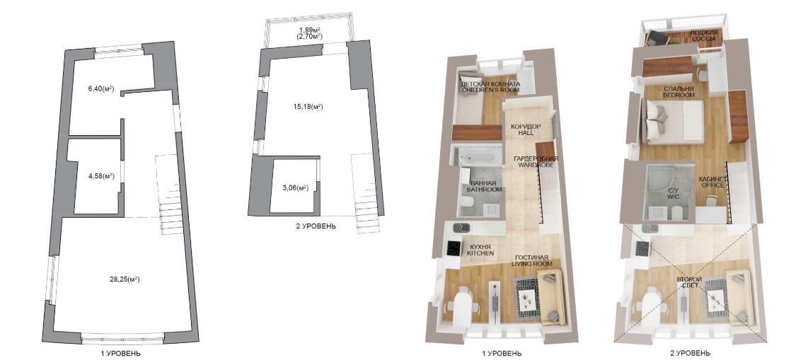 · Каждая квартира имеет 2 уровня - антресольный этаж