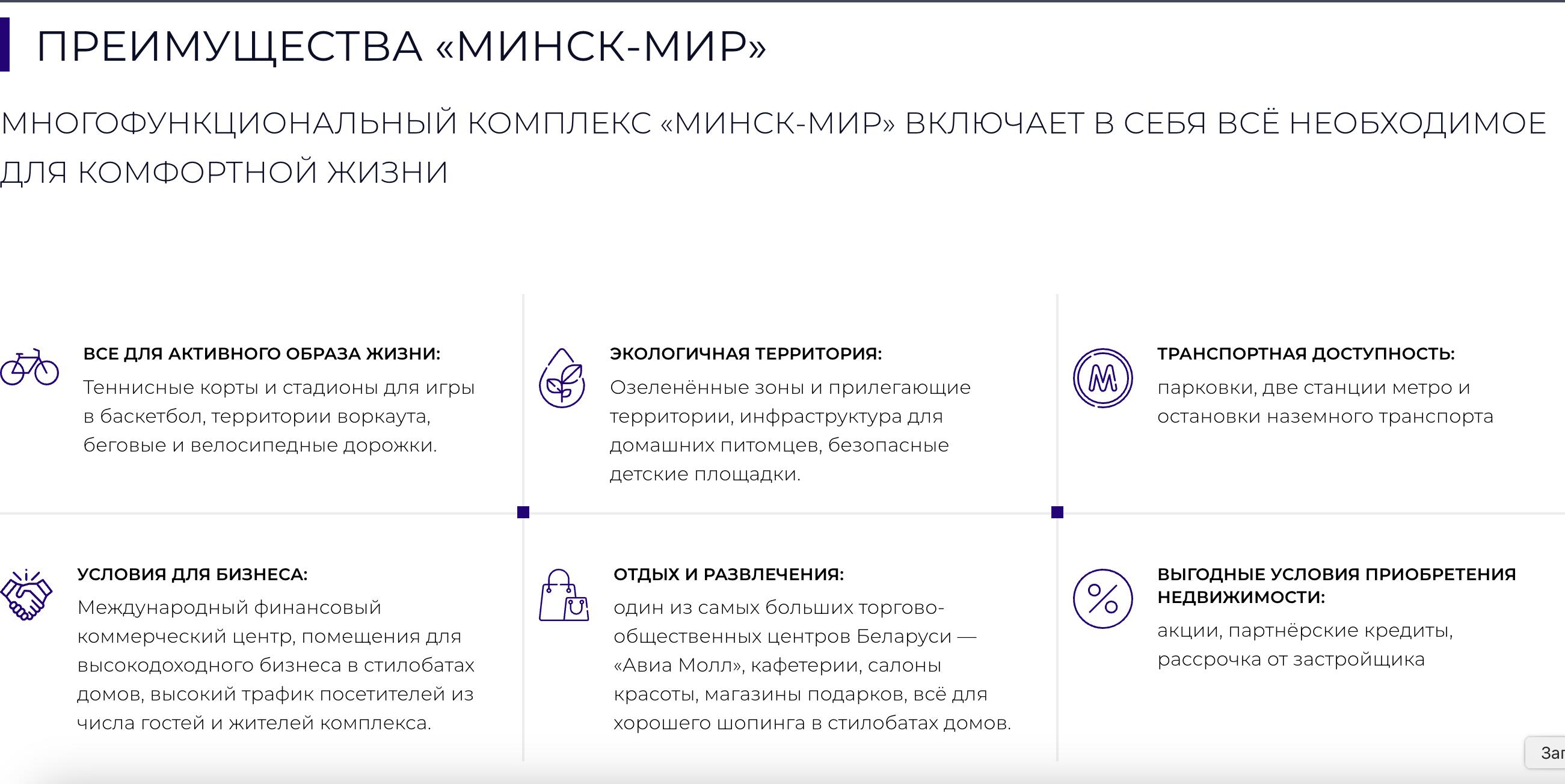 19-этажный монолитно-каркасный дом Квартиры свободной планировки с возможностью объединения Высота потолков 2,7-3 метра По 2 бесшумных скоростных лифта OTIS в подъезде. Все окна панорамные, с триплексными стеклопакетами импортного производства Остекленные лоджии во всех квартирах В доме 8 помещений (от 45 до 86 м2) для бизнеса. Коммерческая инфраструктура в многофункциональном комплексе Minsk World стремительно развивается. Владельцы кафе и салонов красоты, йога- и фитнес-центров, магазинов для гурманов, расположенных на первых этажах новостроек, сообщают о притоке большого количества посетителей. В многофункциональный комплекс приезжают жители других районов, городов и даже стран, чтобы посмотреть на красивую архитектуру, погулять по безопасным бульварам и сделать выгодную инвестицию в самую твёрдую из валют - м2 престижной недвижимости с высоким потенциалом роста.