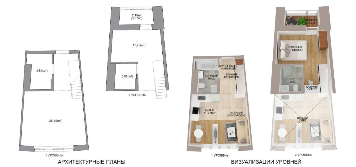 · Каждая квартира имеет 2 уровня - антресольный этаж