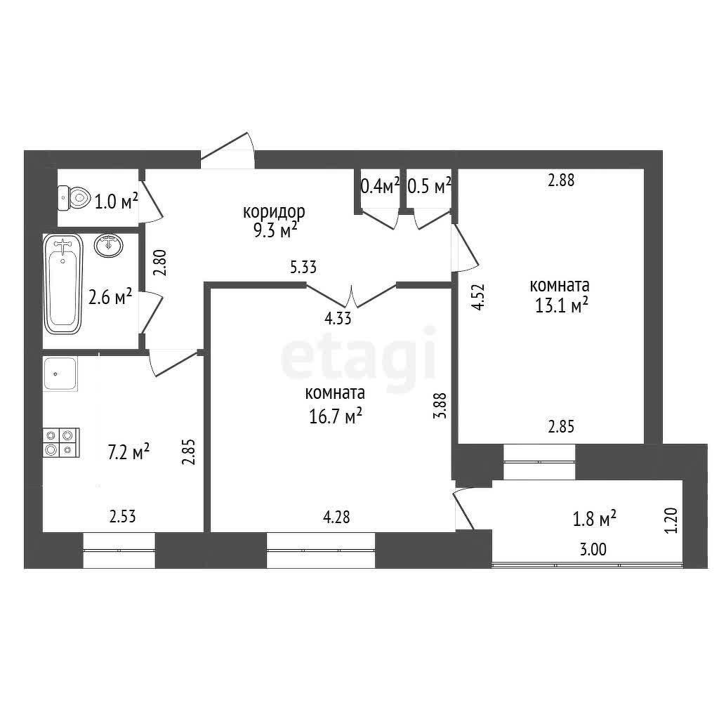 Площадь квартиры: 52,6м2Спальня: 16,7 м2Зал: 13,1 м2Кухня: 7,2 м2
