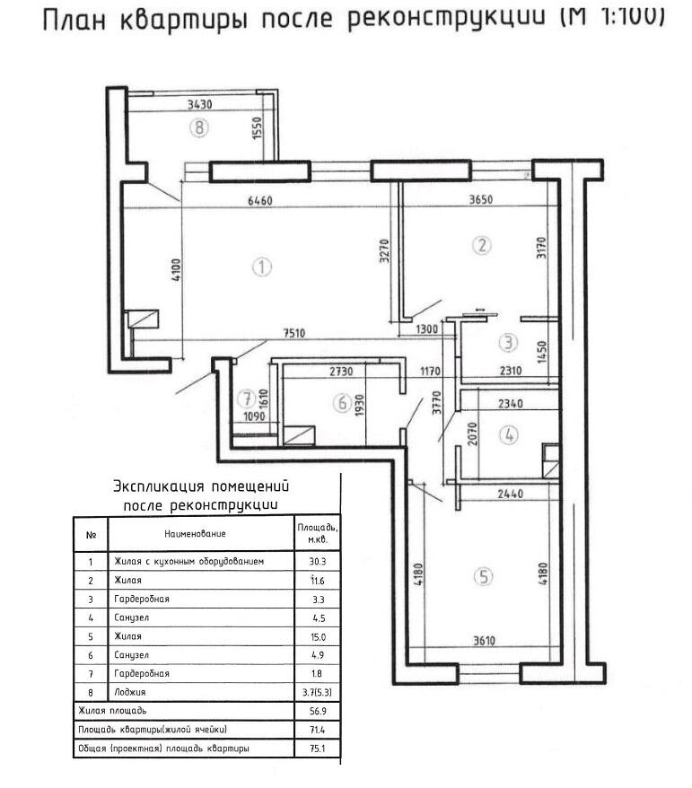 Квартира находится в стадии реконструкции по утвержденному проекту. Предусмотрены кухня-гостиная и отдельные две комнаты . В одной комнате организована гардеробная.