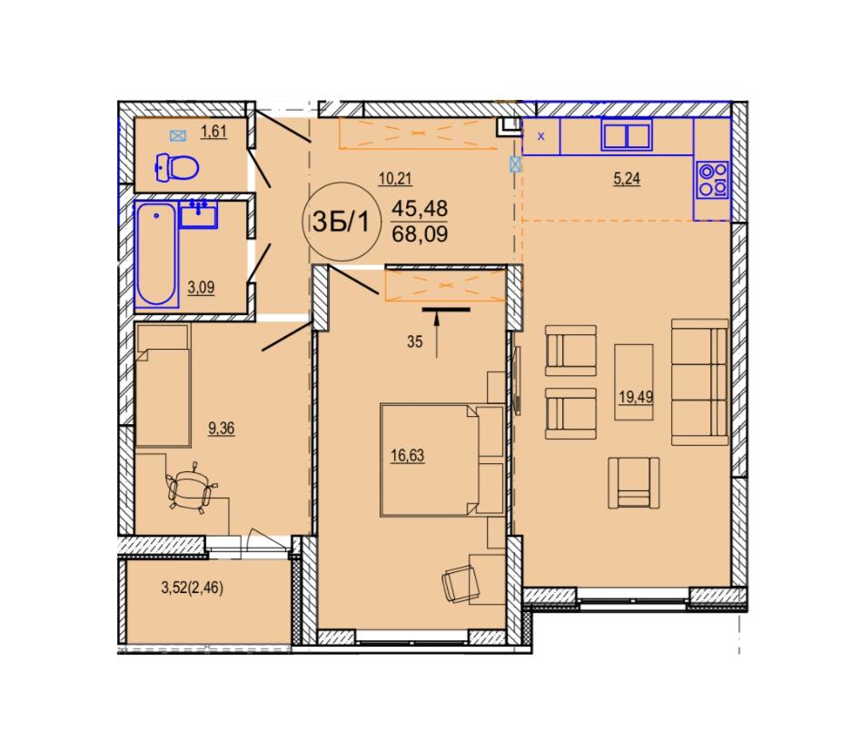 Высота потолка - 2,5 м (21 этаж – 3м).