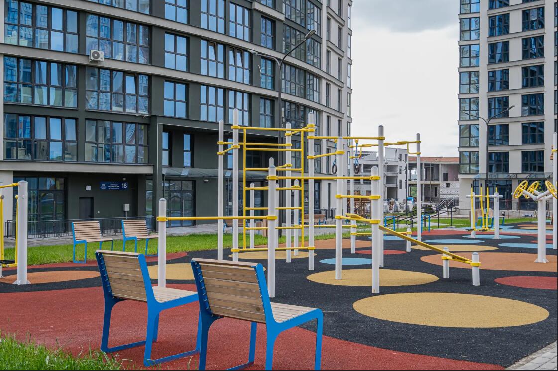 · Внутри квартала - детские площадки для разных возрастов детей, скамейки, вело парковки