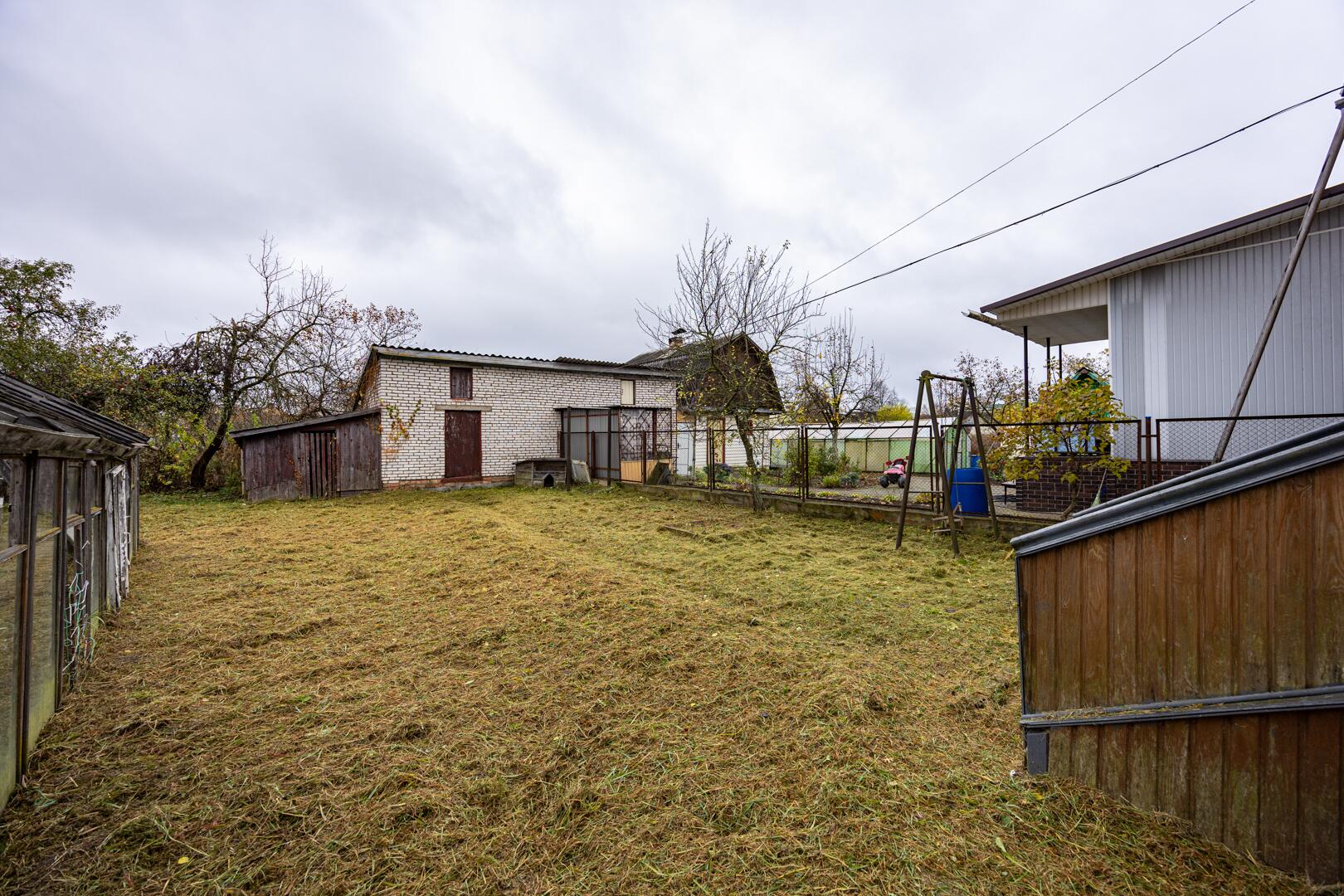 Участок вокруг дома составляет 13,21 соток, ровный, сухой. Находится в пожизненном наследуемом владении. Посажен сад. Участок ухожен, огорожен забором со всех сторон. На нем расположены несколько хоз. построек: добротный кирпичный гараж и сарай, просторная теплица.