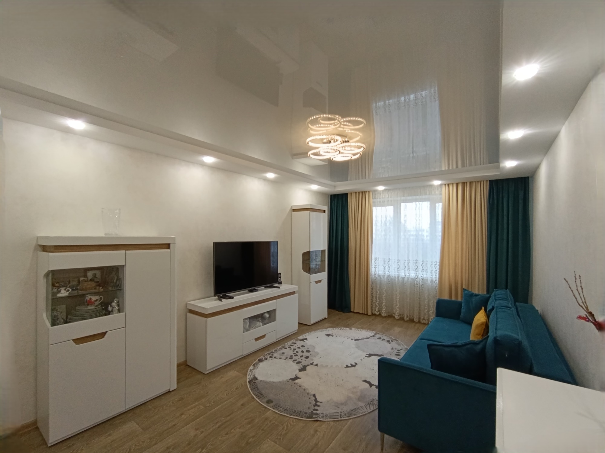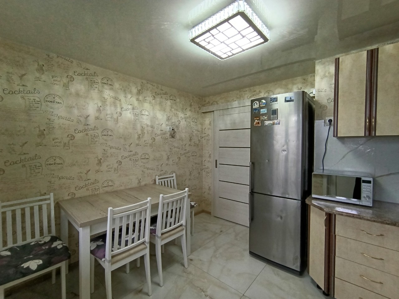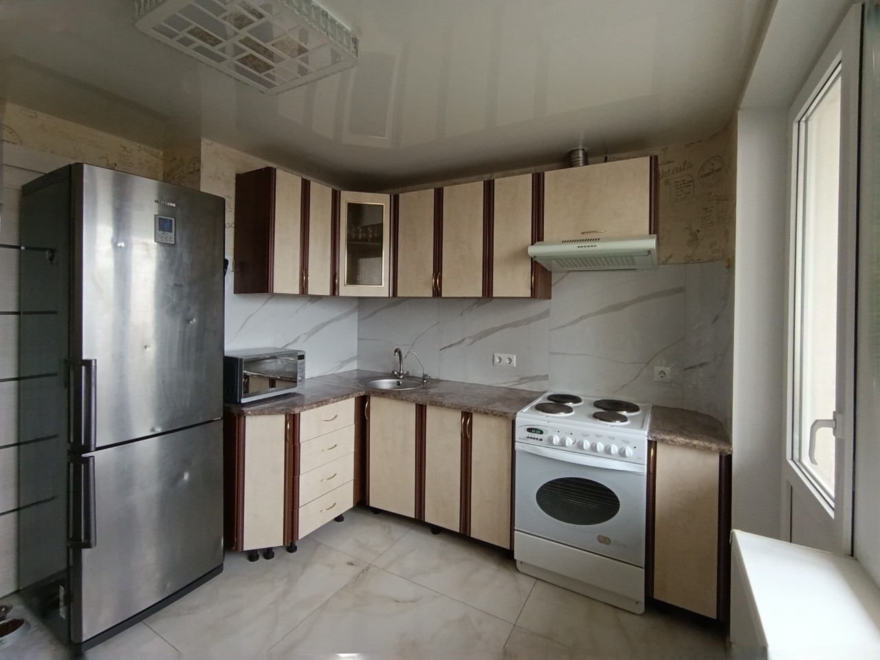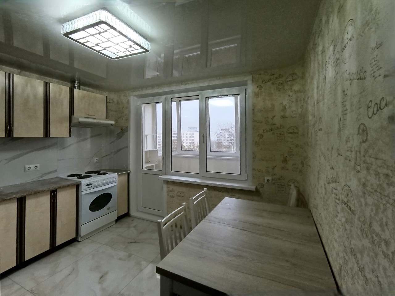 Отличный современный ремонт. Металлическая входная дверь, межкомнатные двери МДФ, натяжные потолки, шкаф-купе, встроенная кухня, стеклопакеты ПВХ застеклены окна в квартире и две лоджии.