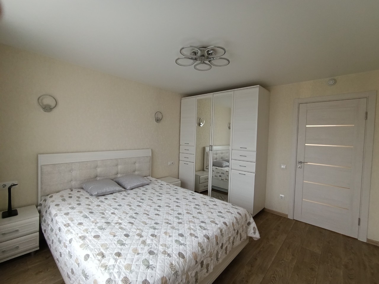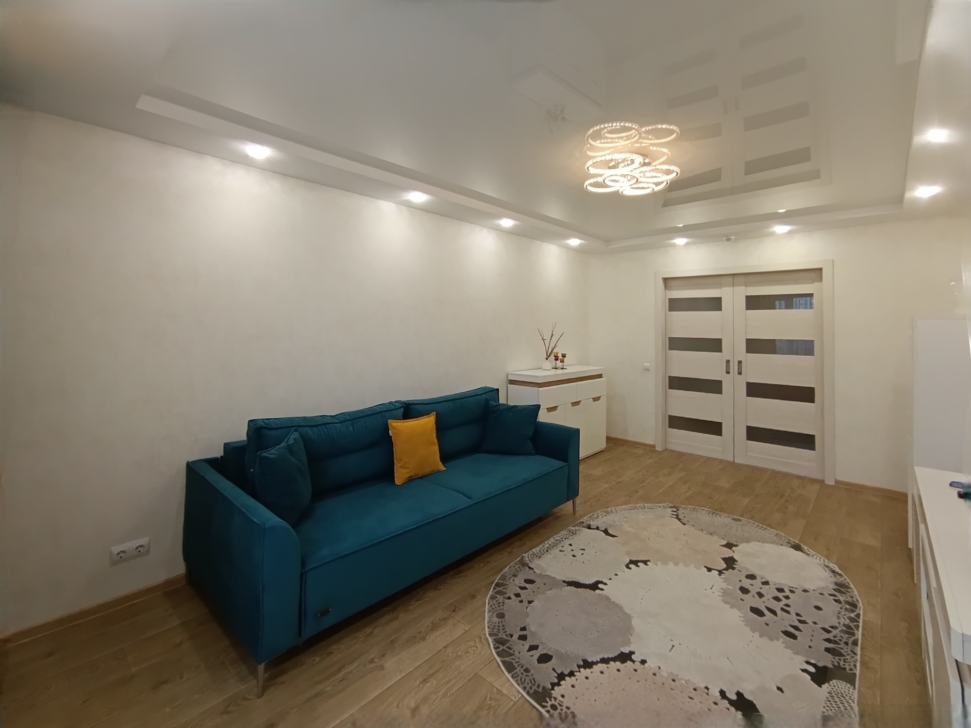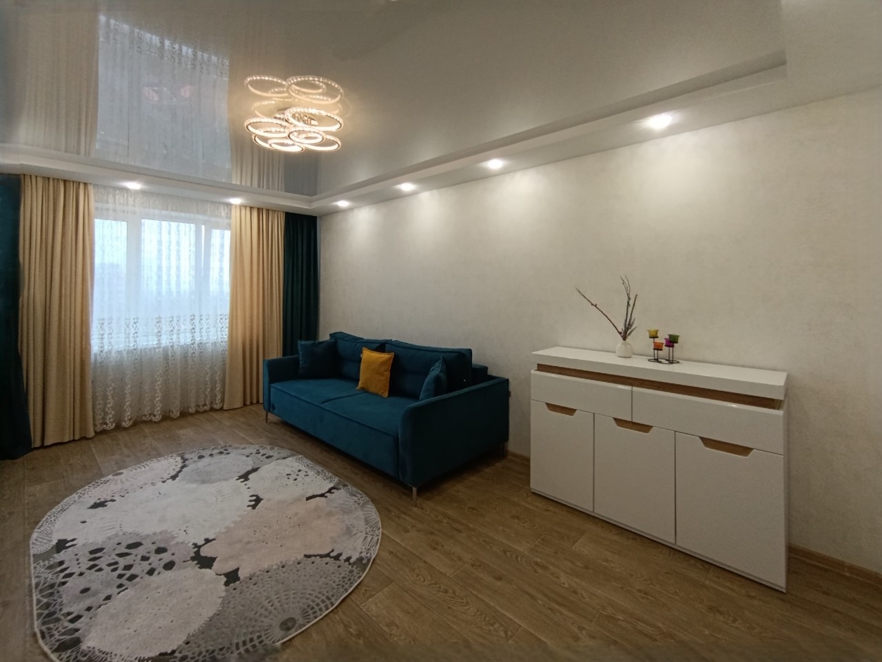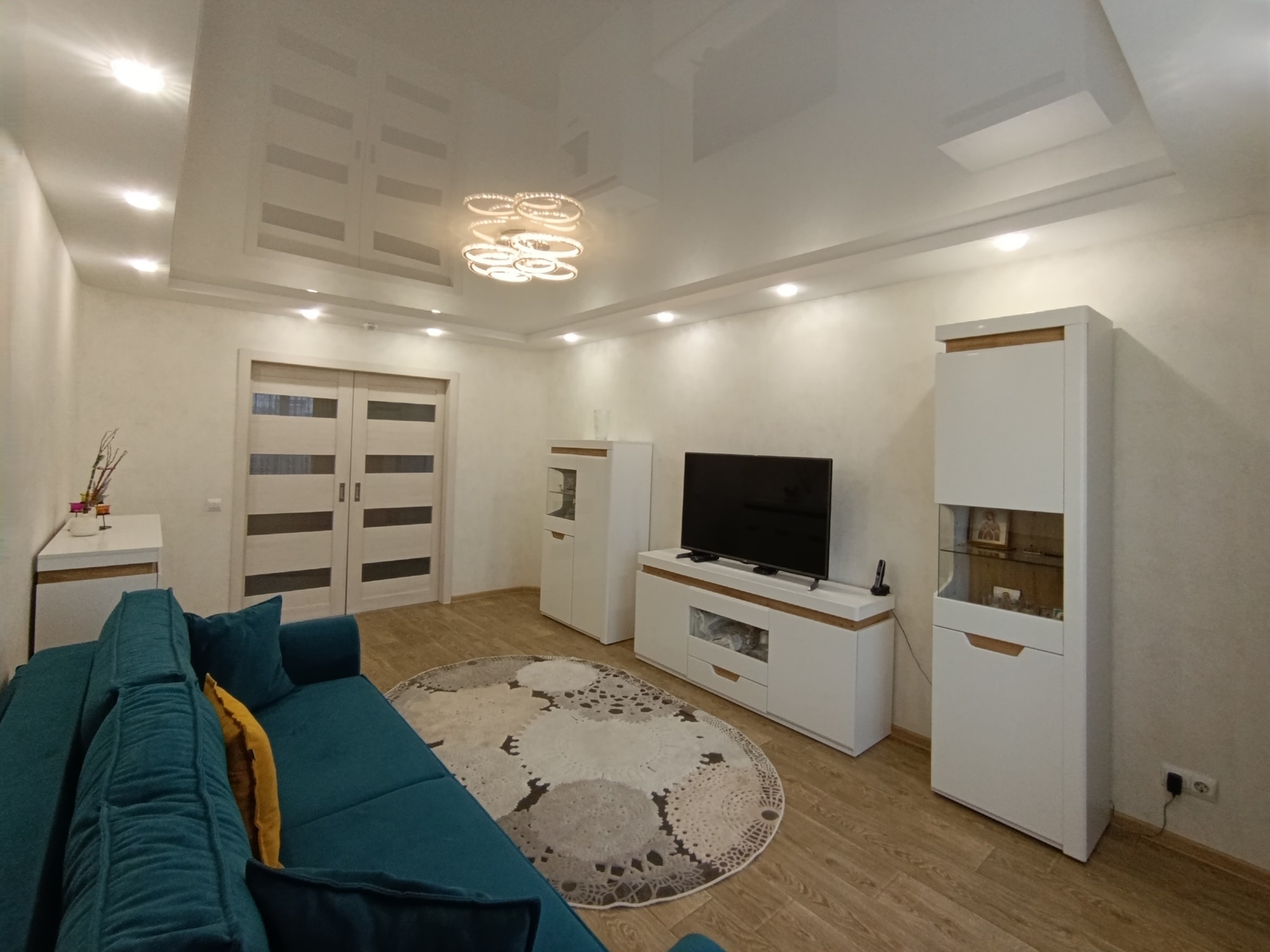 Отличный современный ремонт. Металлическая входная дверь, межкомнатные двери МДФ, натяжные потолки, шкаф-купе, встроенная кухня, стеклопакеты ПВХ застеклены окна в квартире и две лоджии.
