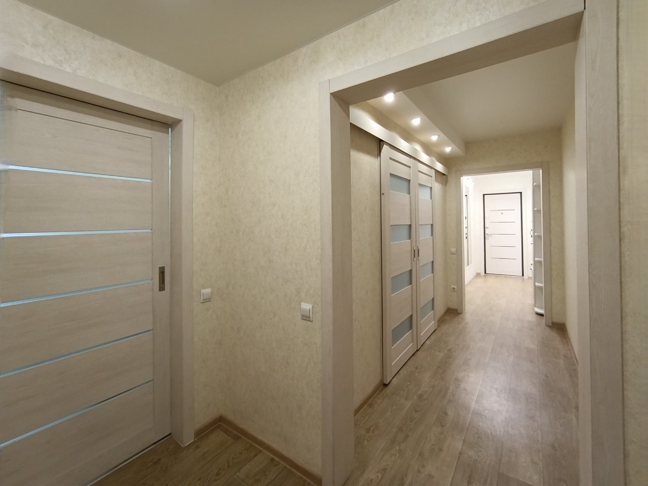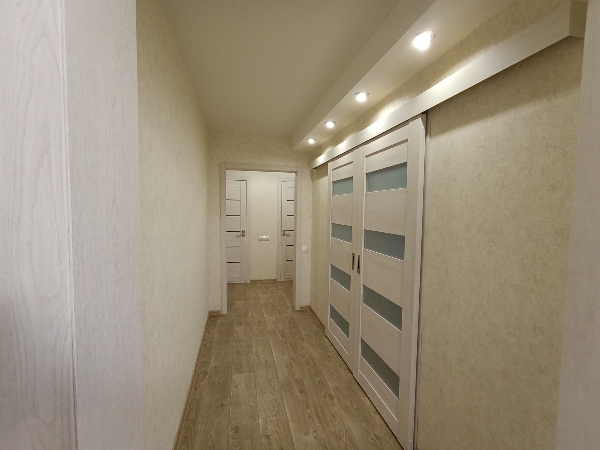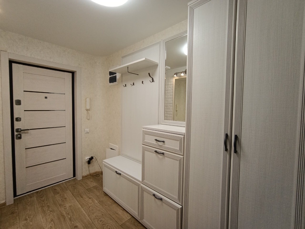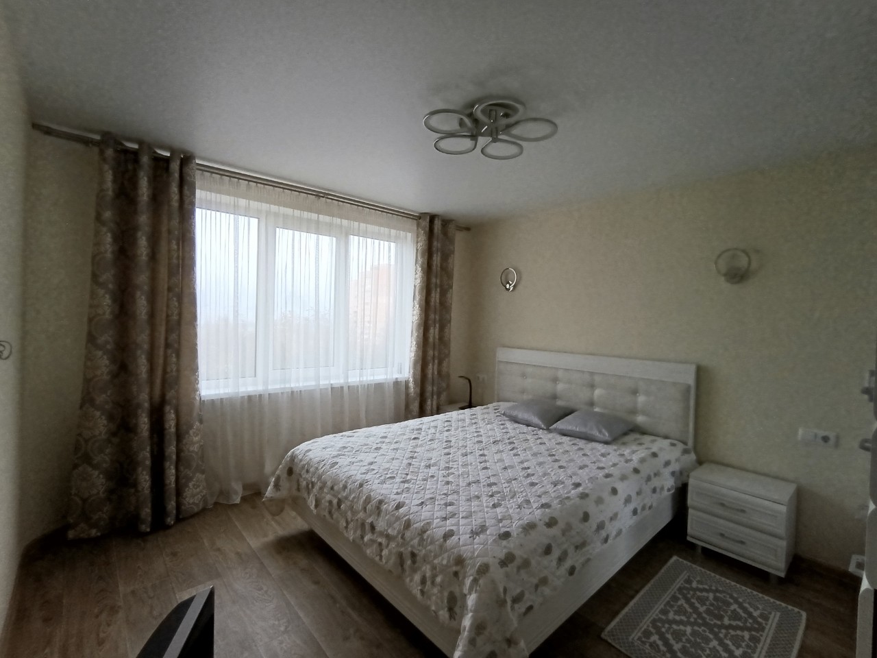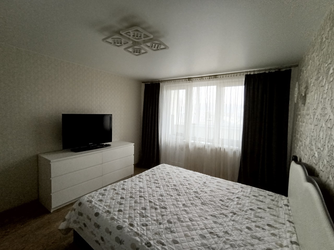 Отличный современный ремонт. Металлическая входная дверь, межкомнатные двери МДФ, натяжные потолки, шкаф-купе, встроенная кухня, стеклопакеты ПВХ застеклены окна в квартире и две лоджии.