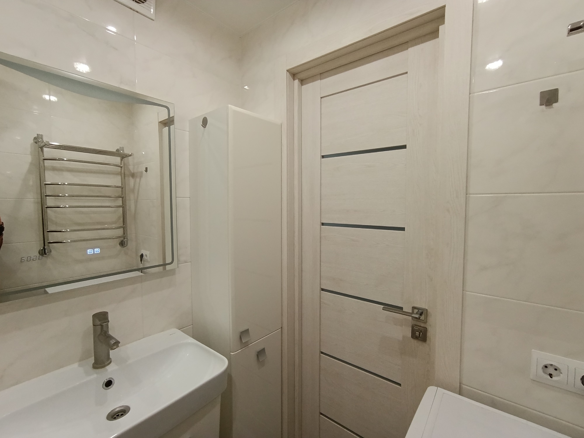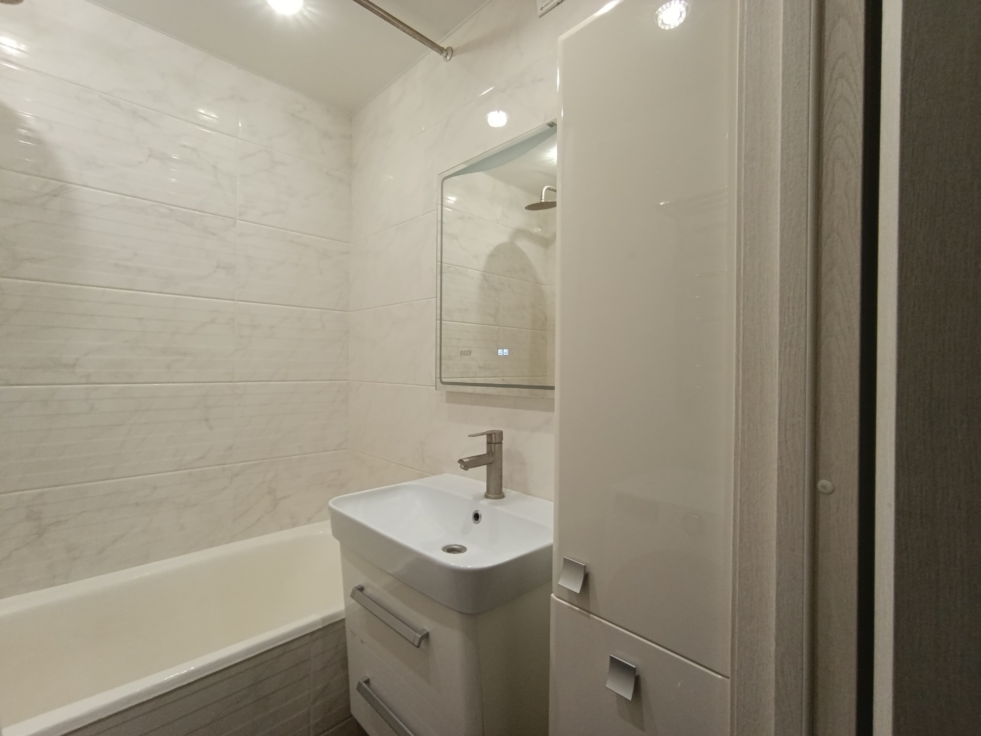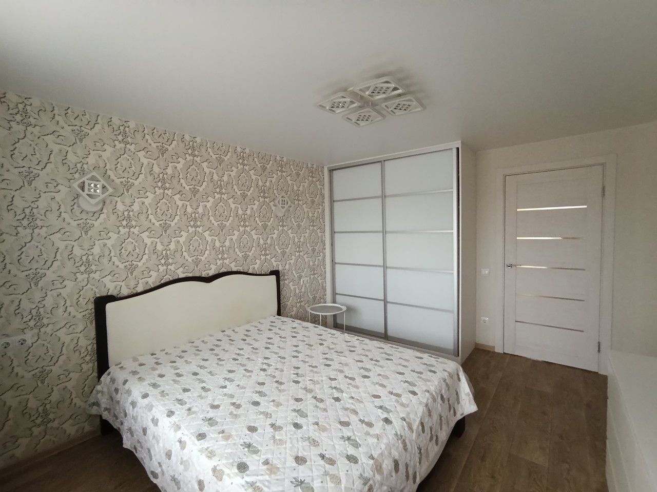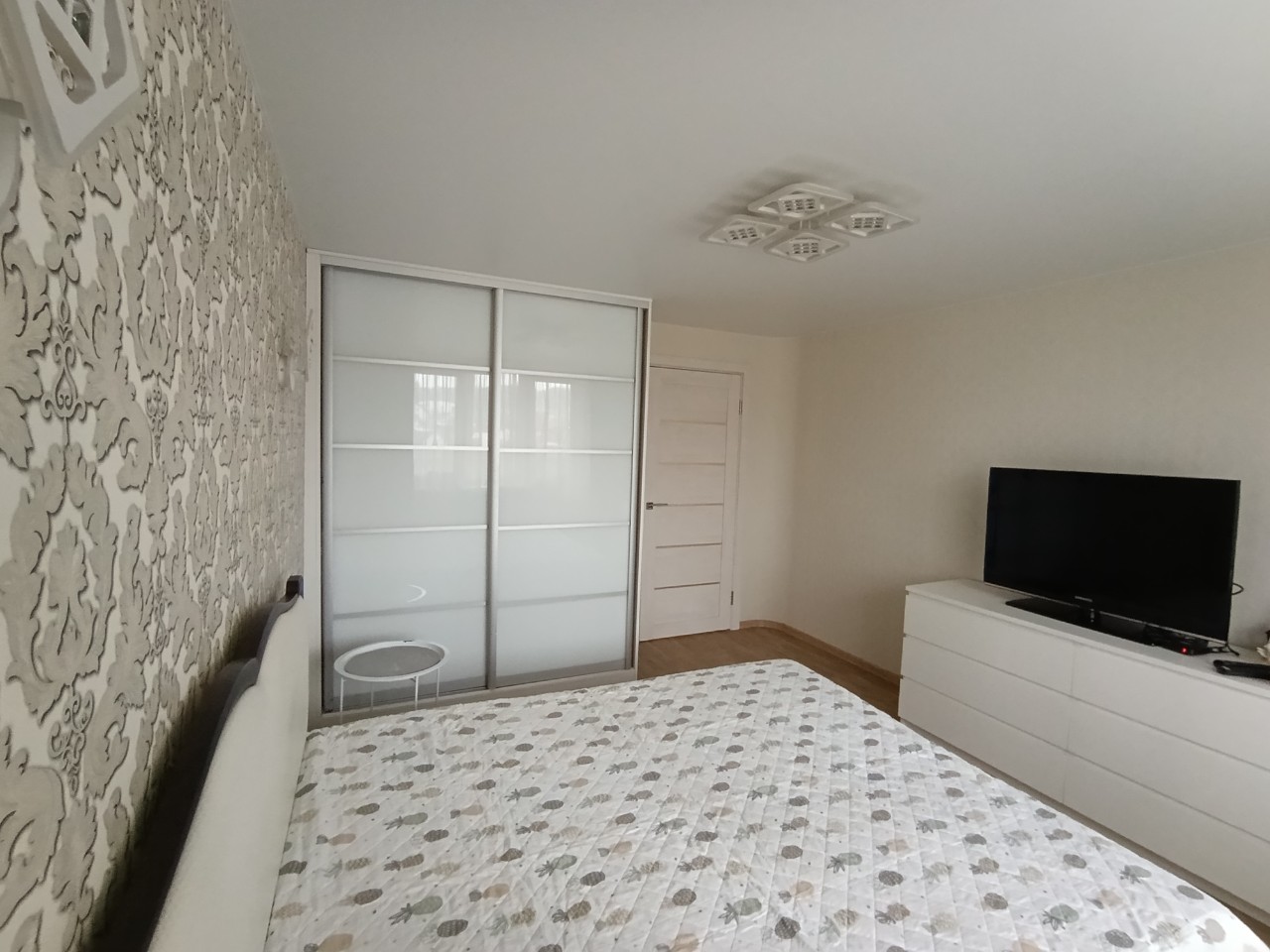 Отличный современный ремонт. Металлическая входная дверь, межкомнатные двери МДФ, натяжные потолки, шкаф-купе, встроенная кухня, стеклопакеты ПВХ застеклены окна в квартире и две лоджии.