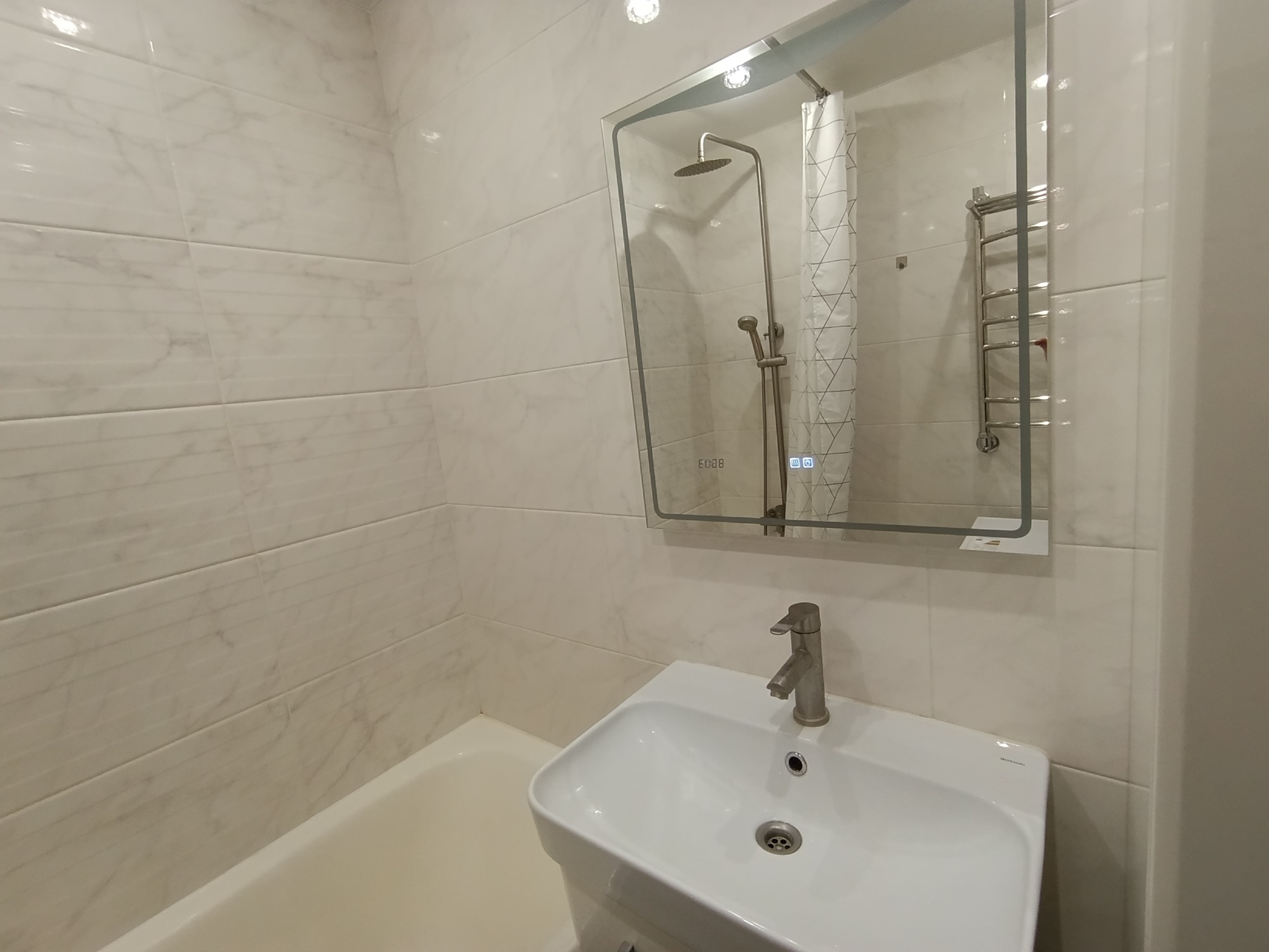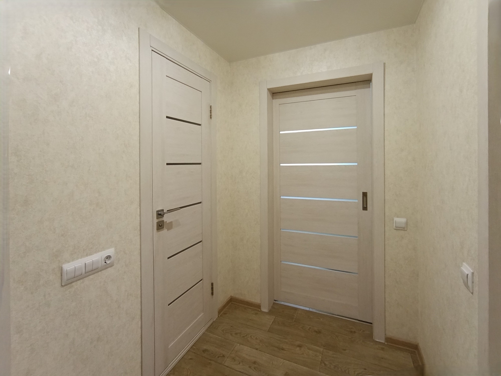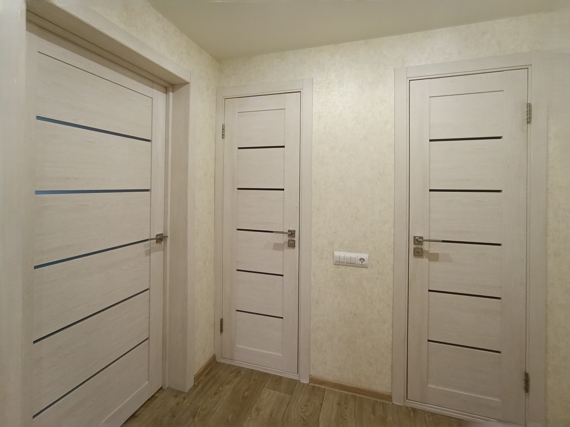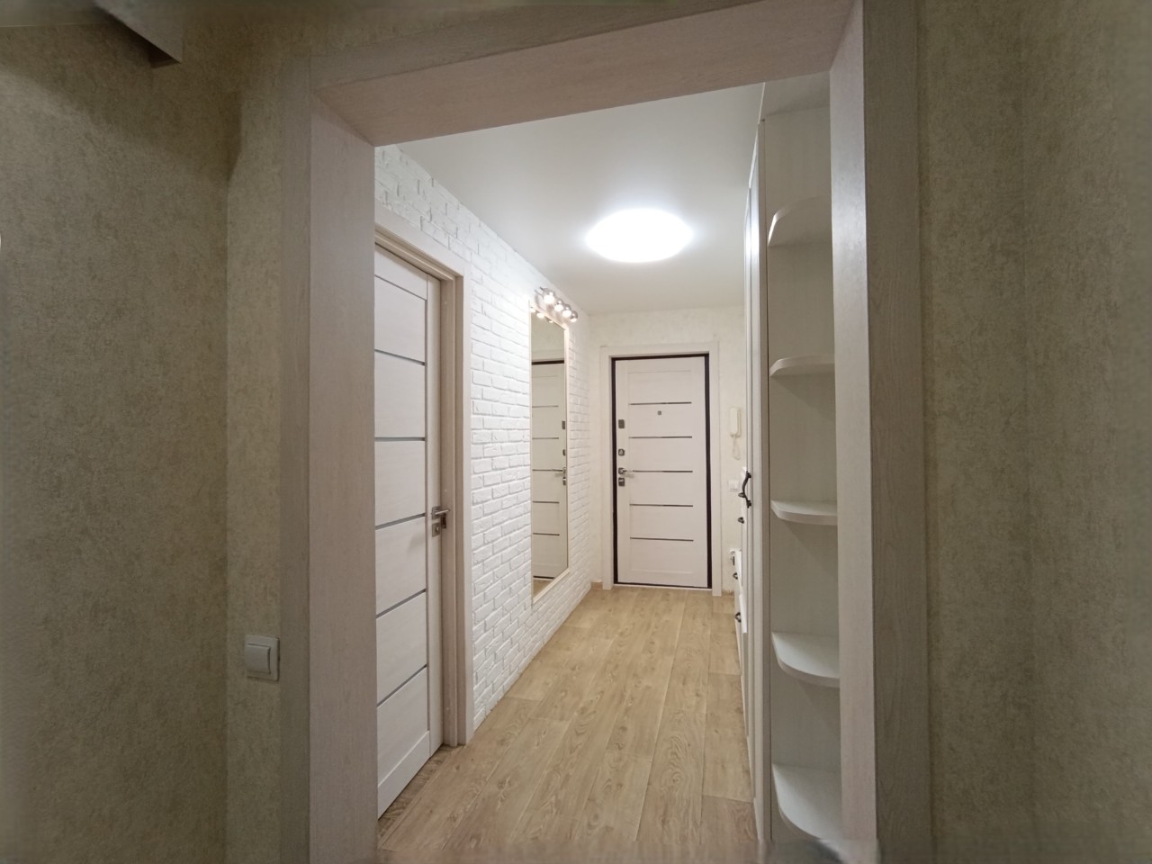 Отличный современный ремонт. Металлическая входная дверь, межкомнатные двери МДФ, натяжные потолки, шкаф-купе, встроенная кухня, стеклопакеты ПВХ застеклены окна в квартире и две лоджии.