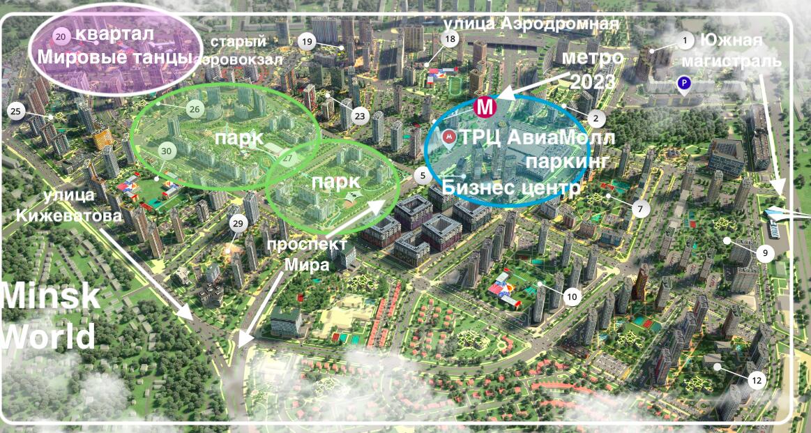 Квартал располагается в центральной части многофункционального комплекса ЖК Минск-Мир, где реализован передовой концепт городской застройки — «15-минутный город».