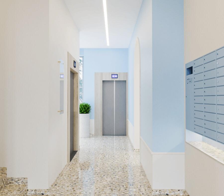 Полы и порталы лифтового холла будут выполнены из керамогранита. Подъезды сквозные. Один из выходов ведёт на прилегающую территорию, а второй на улицу и парковку. Можно быстро подойти к наземной стоянке, связанной с одной из прилегающих магистралей, выехать в сторону кругового движения у здания старого аэропорта и достичь любой точки города за 15 минут!