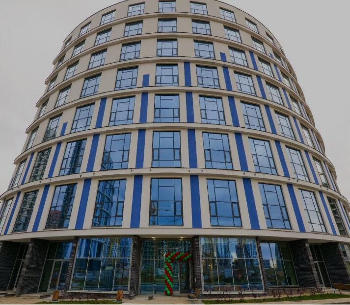 Дугообразная форма здания плавно вписывается в природный ландшафт и повторяет линии парковых зон.