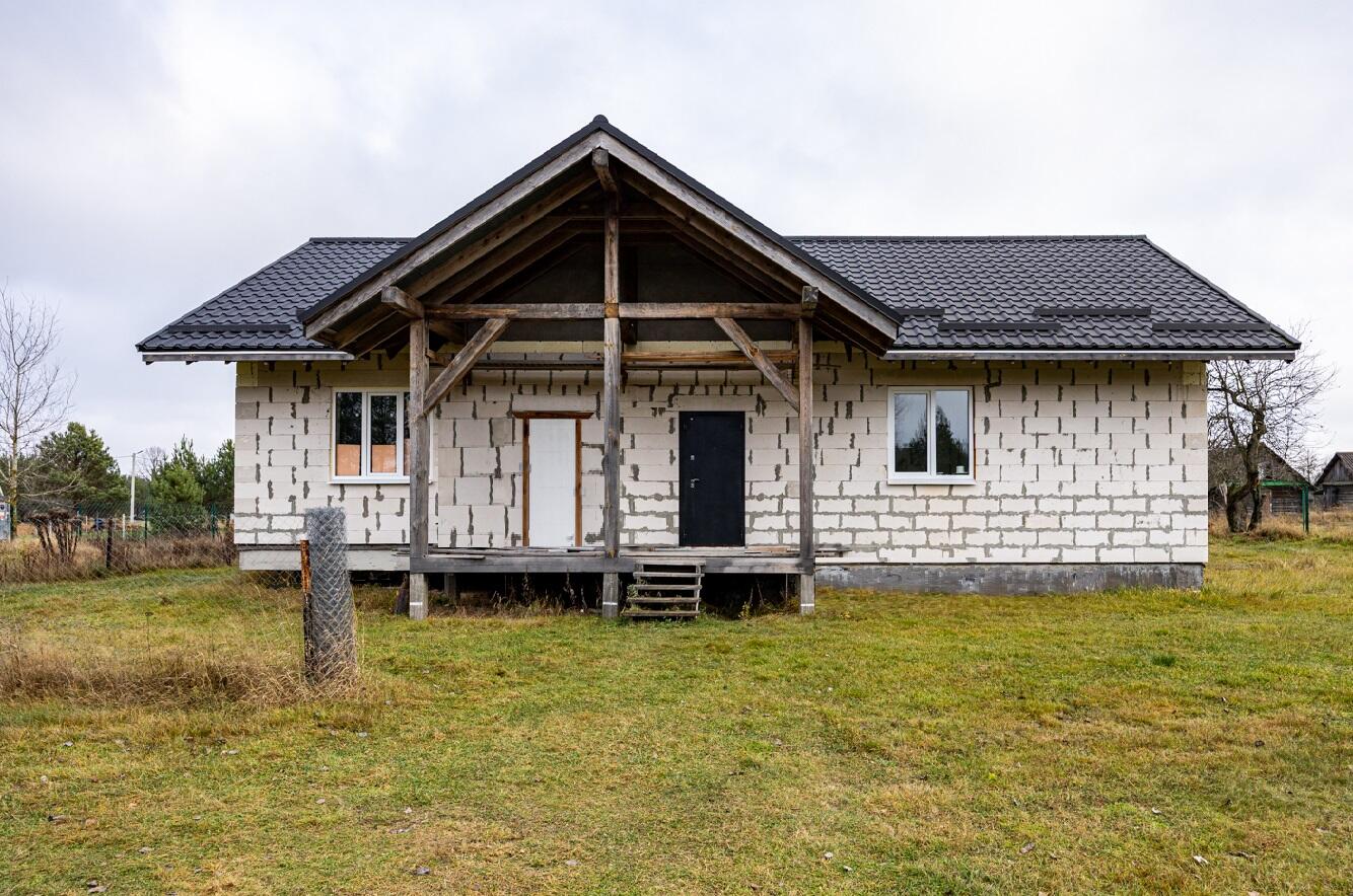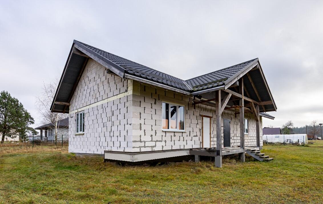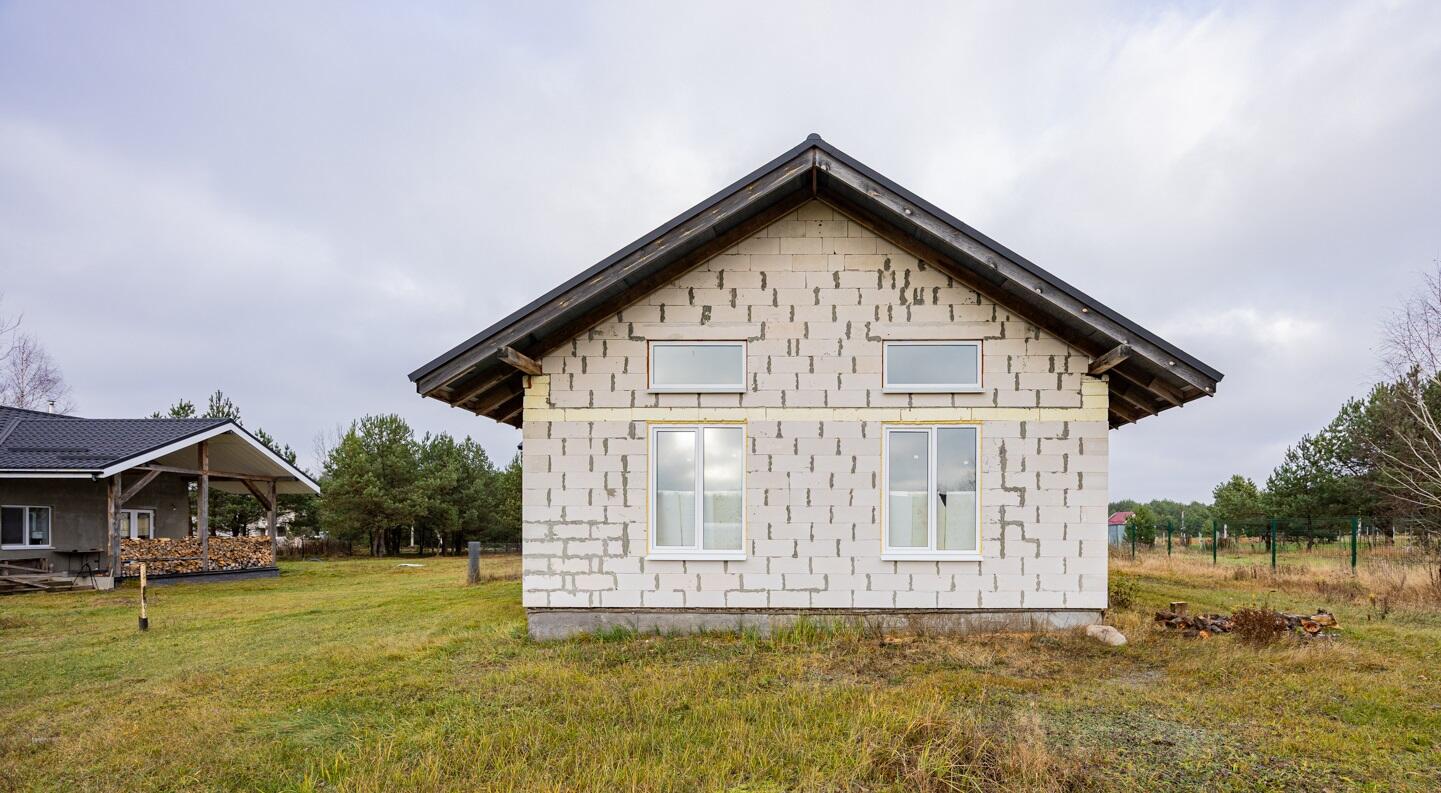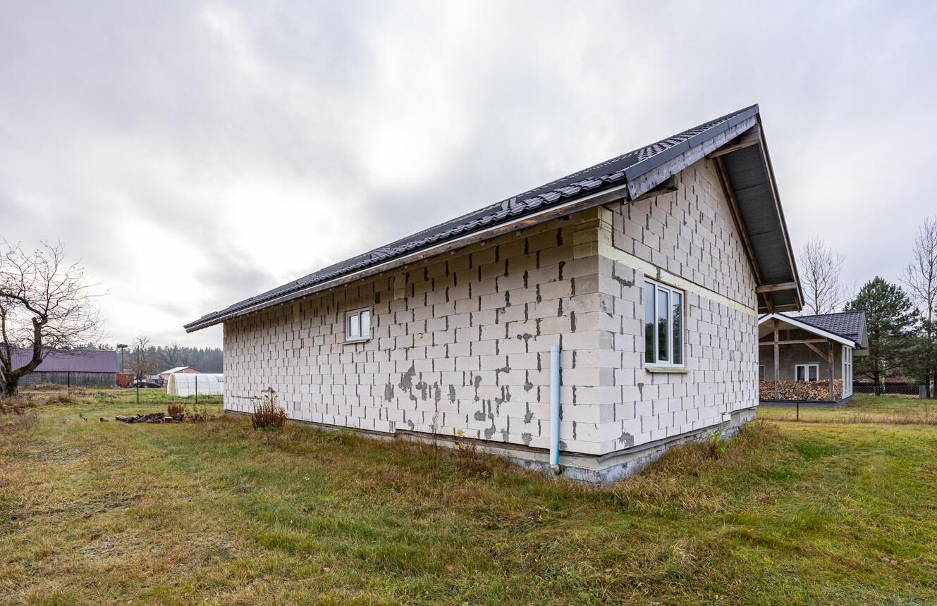 Наружные и внутренние стены дома без отделки. Высота подкровельного пространства позволяет обустройство второго этажа.
