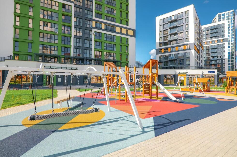 Спортивные площадки, вело парковки и благоустроенные дворы.