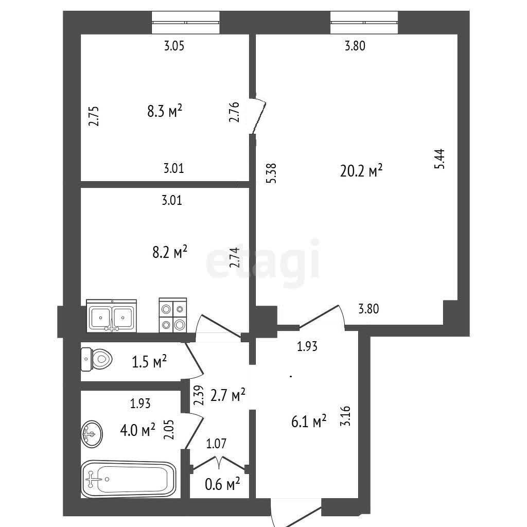 Зал: 20,2 м2 (с большим шкафом-купе)