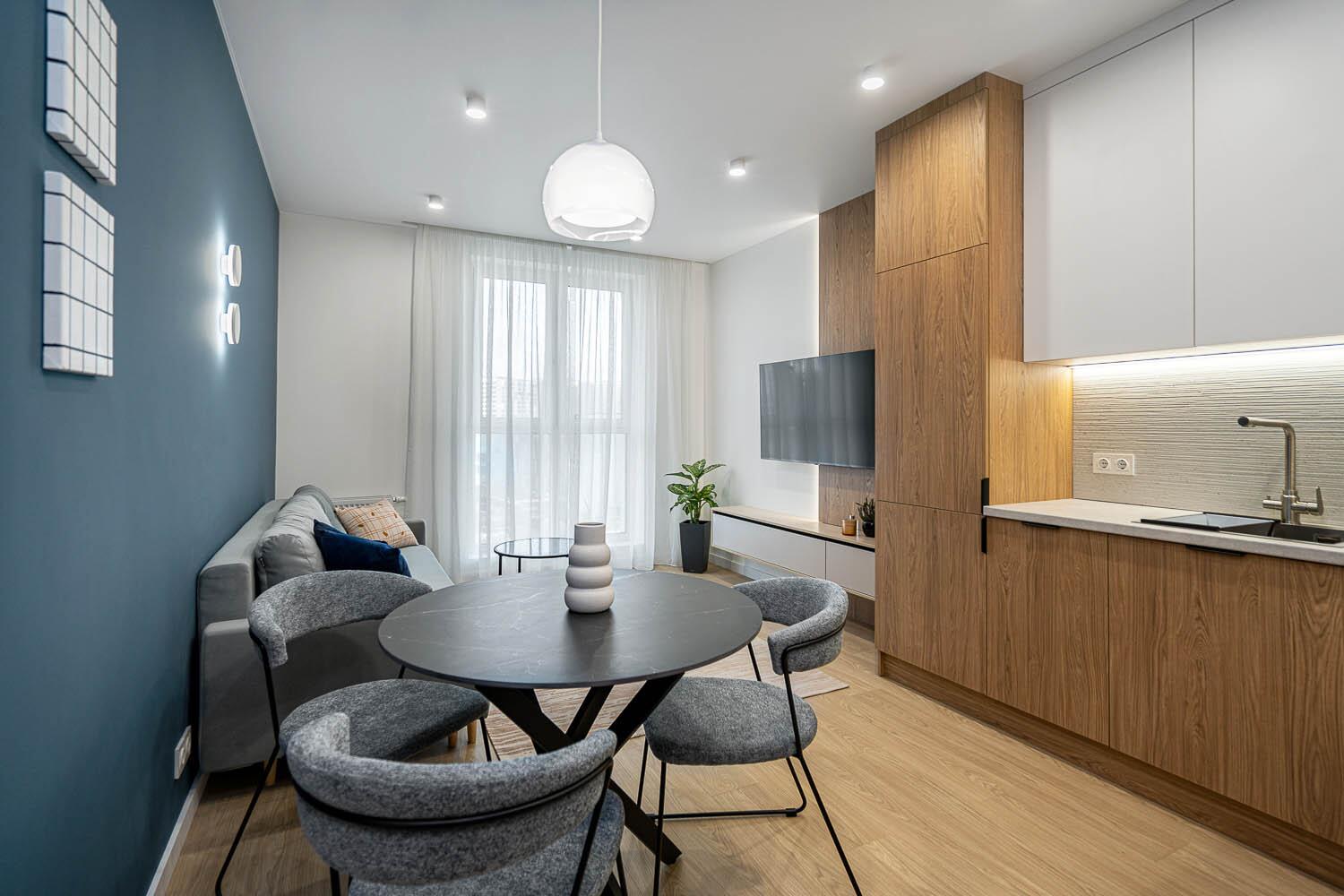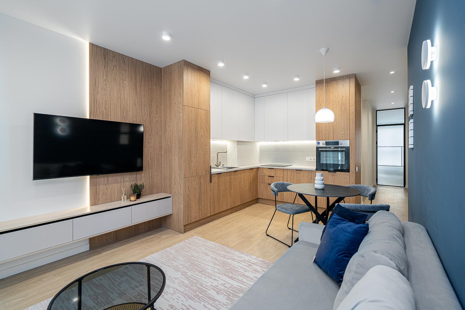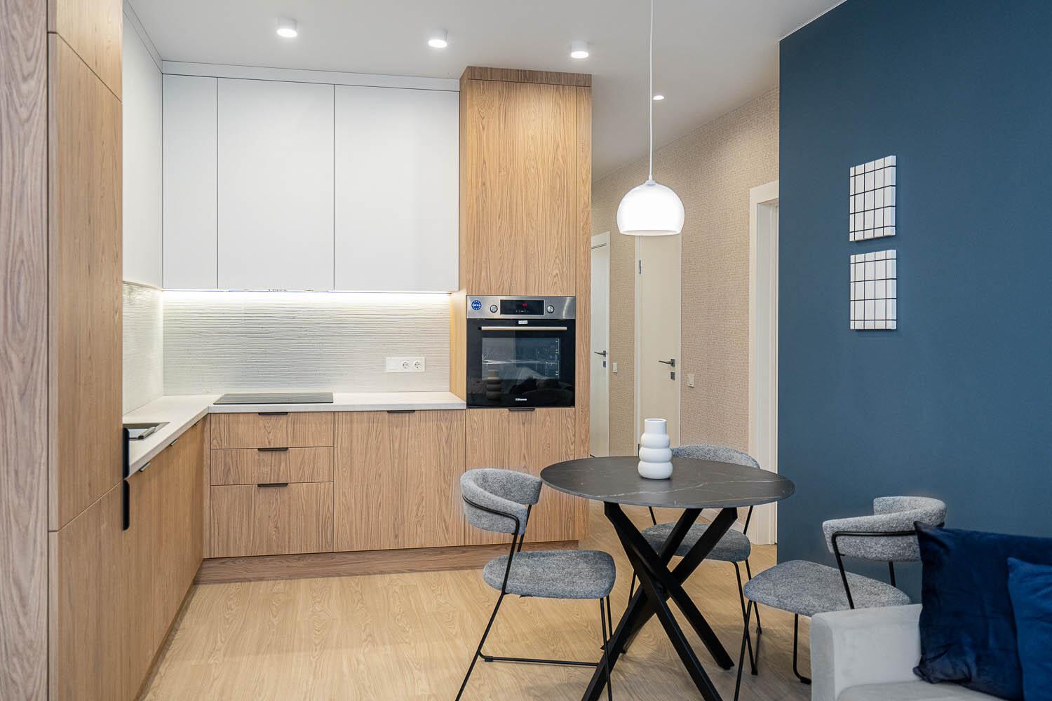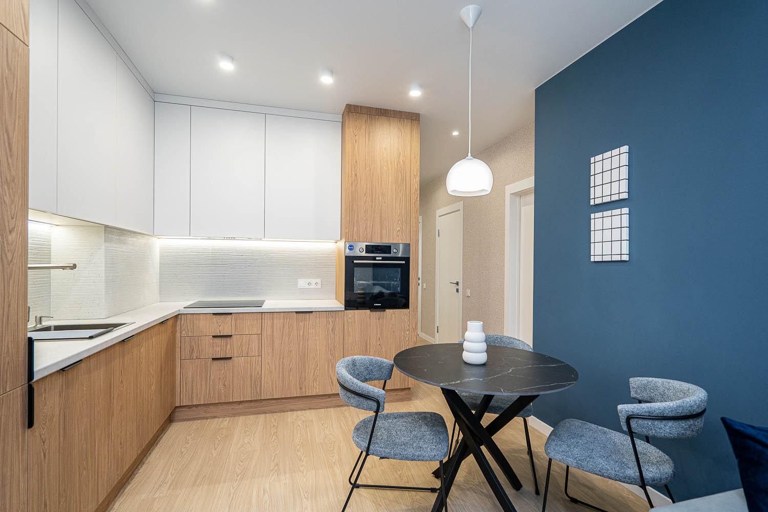+ удобная кухня-гостиная со всей необходимой техникой европейской сборки, качественной фурнитурой и достаточным количеством мест для хранения;