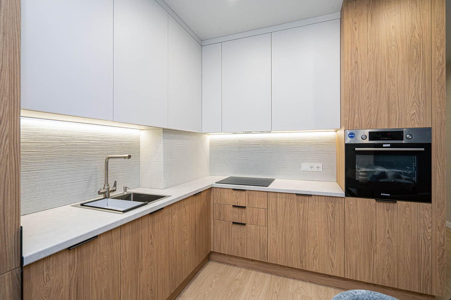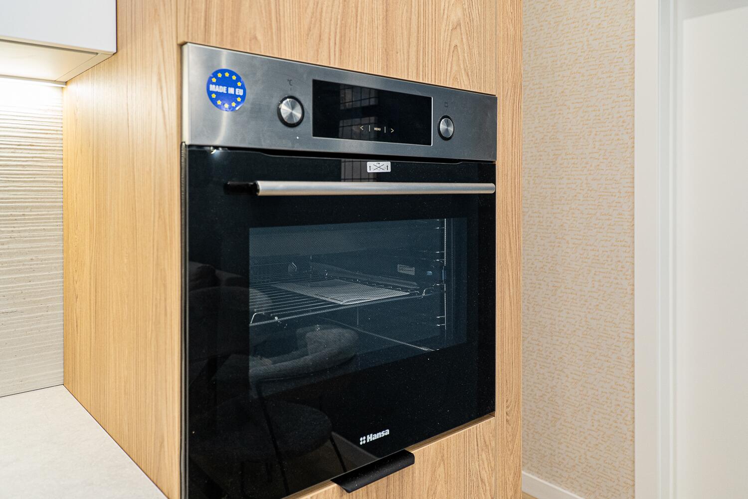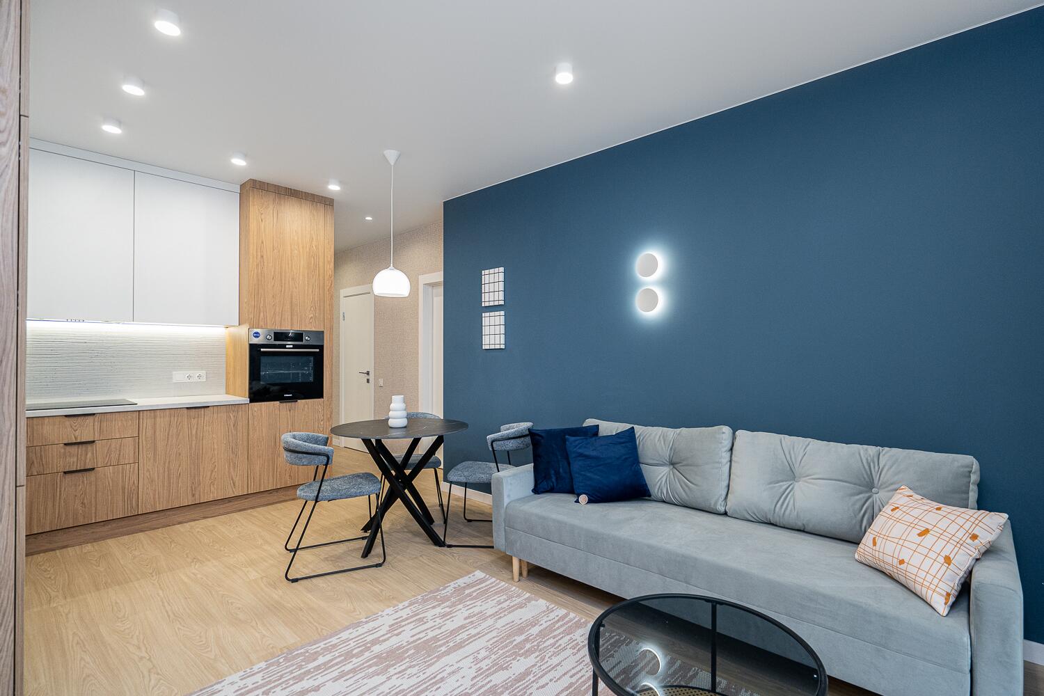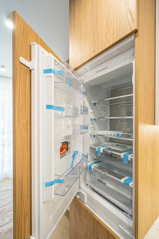 + удобная кухня-гостиная со всей необходимой техникой европейской сборки, качественной фурнитурой и достаточным количеством мест для хранения;