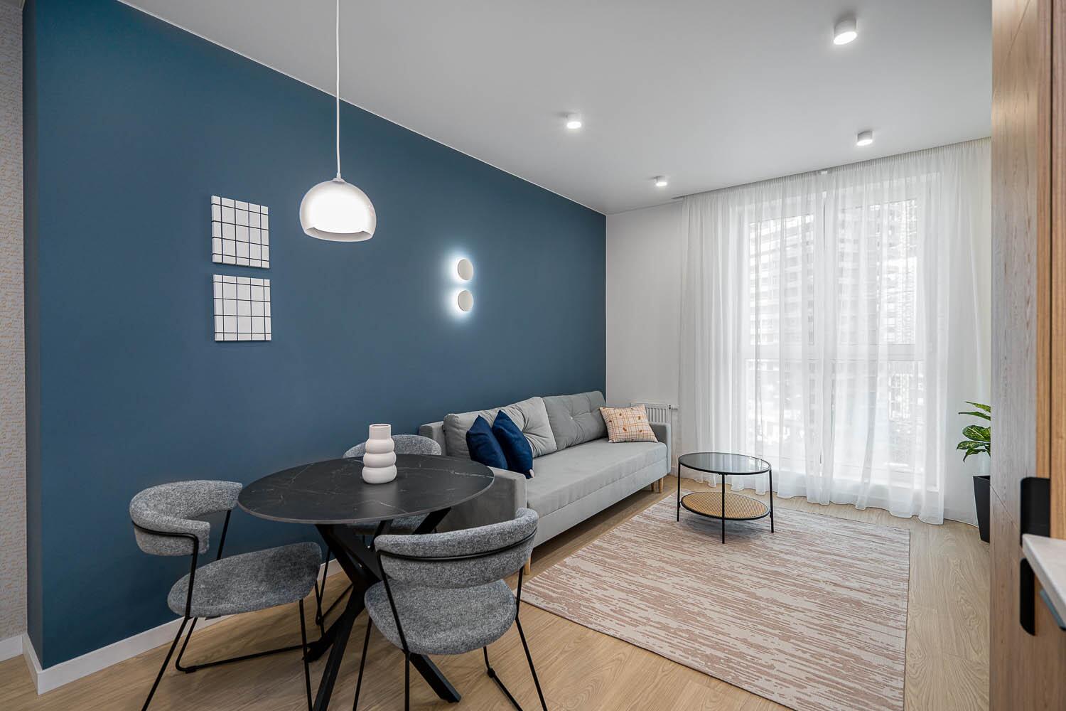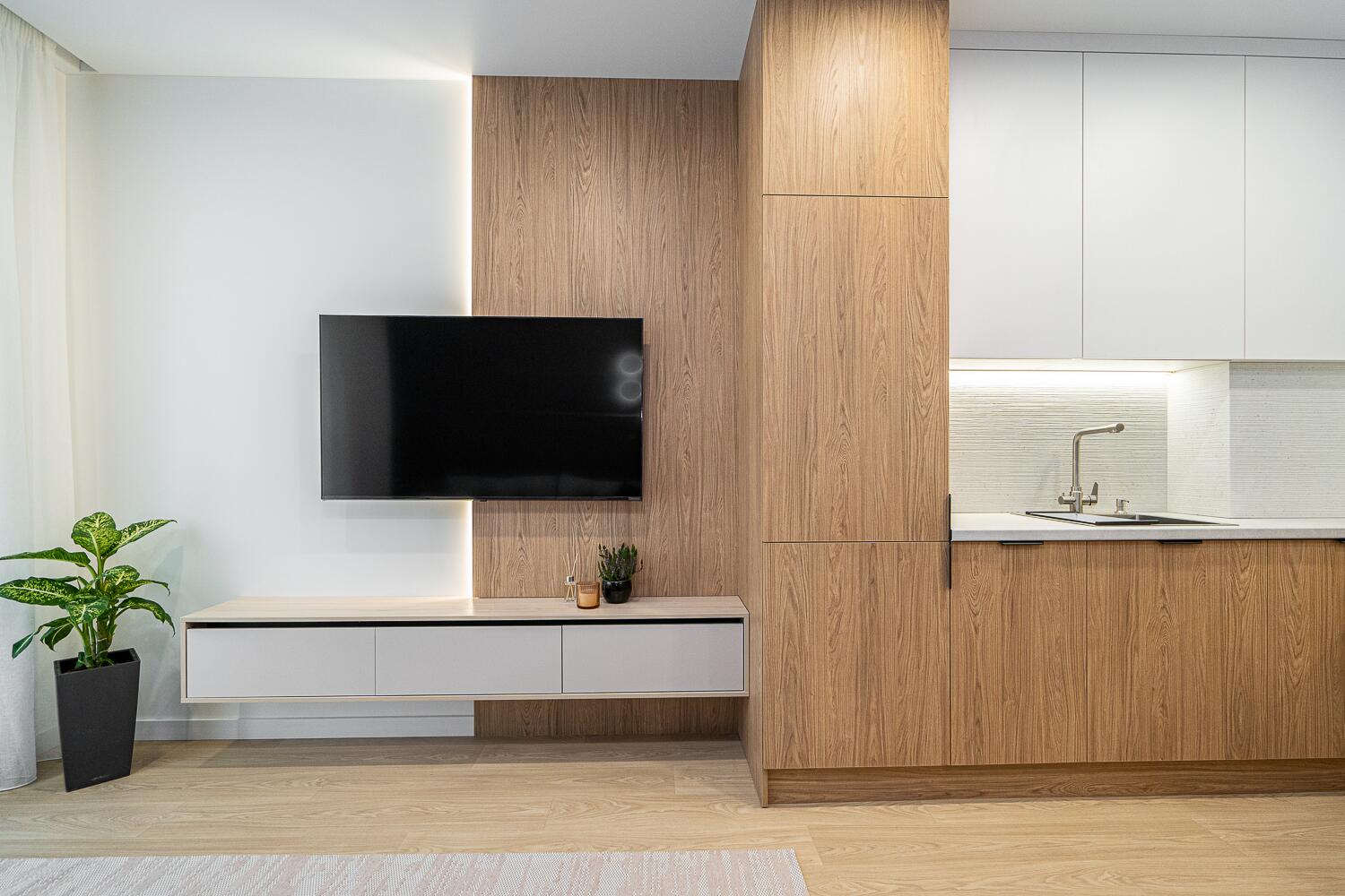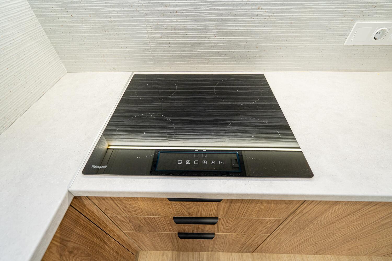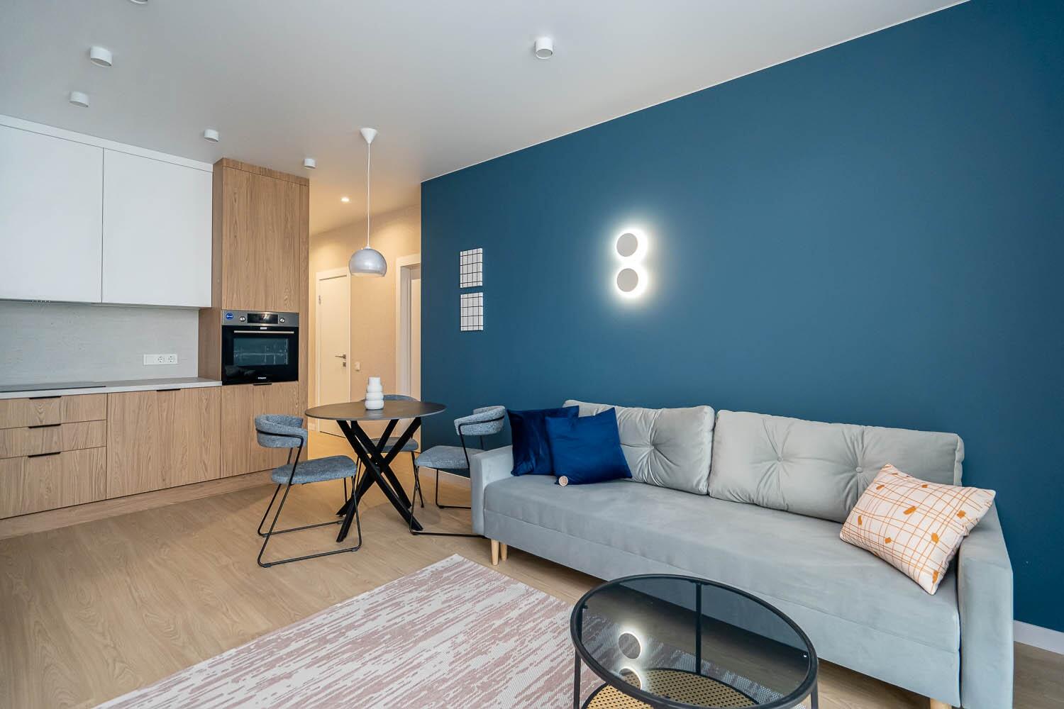 + удобная кухня-гостиная со всей необходимой техникой европейской сборки, качественной фурнитурой и достаточным количеством мест для хранения;
