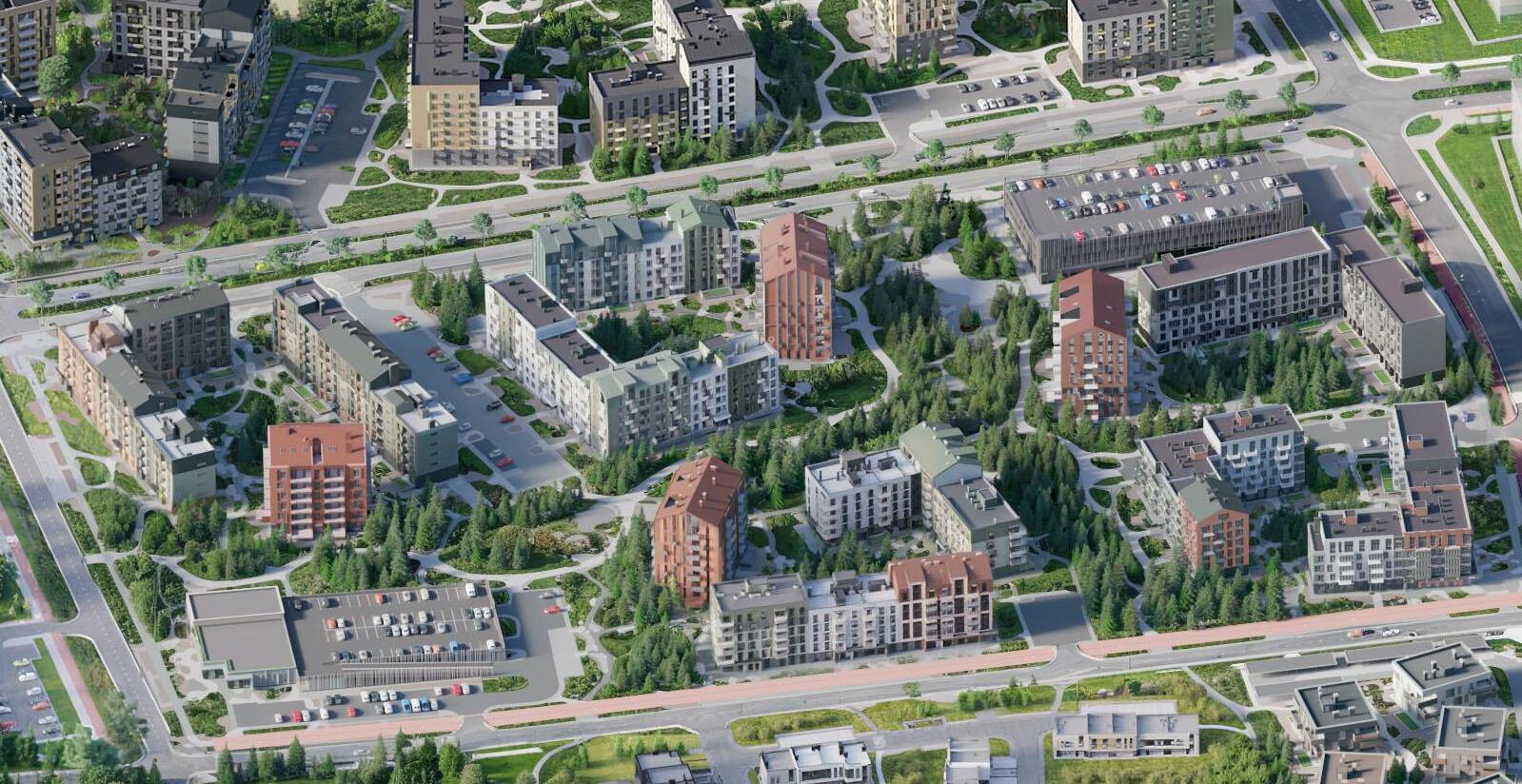 Будет создано из сохранённых лесных деревьев, к которым в дополнение будут высажены кустарники и многолетние травы.