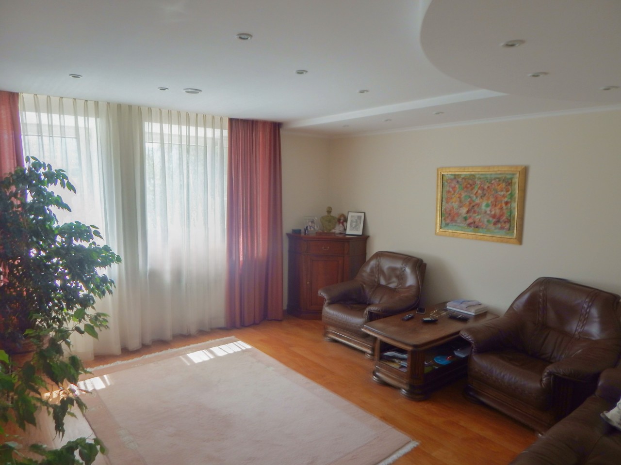 Общая площадь квартиры 144.9м2, жилая 77.2м2 состоит из 4 изолированных комнат, выходящих на разные стороны дома, просторная кухня-гостиная 26.3м2, два санузла.