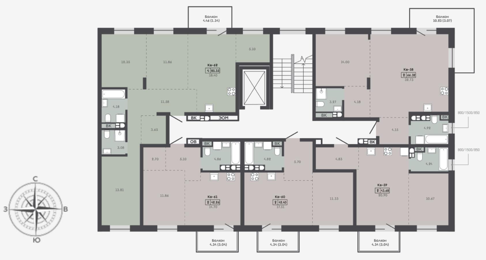 - 3 подъезда 6-5-6 этажей.