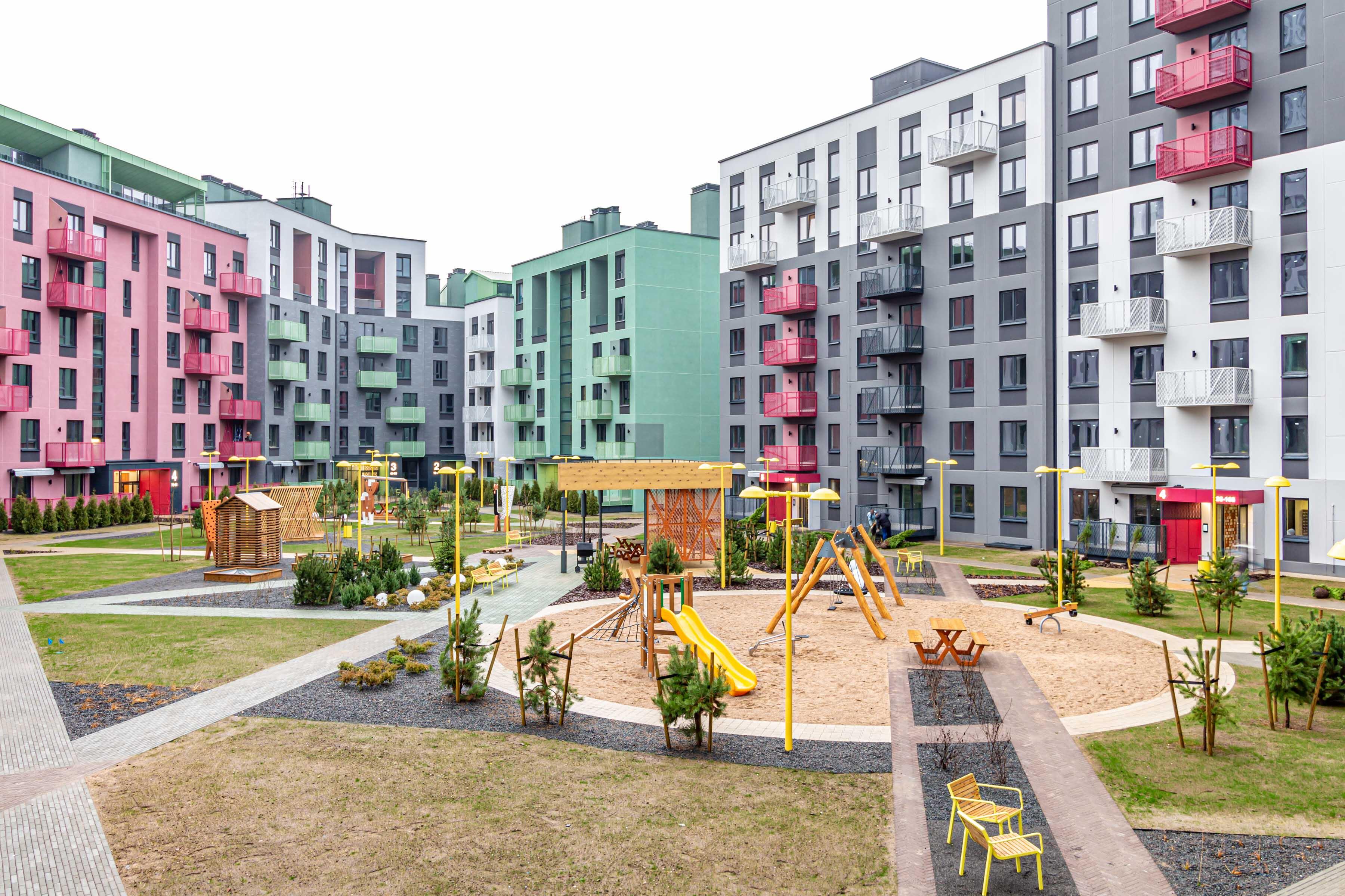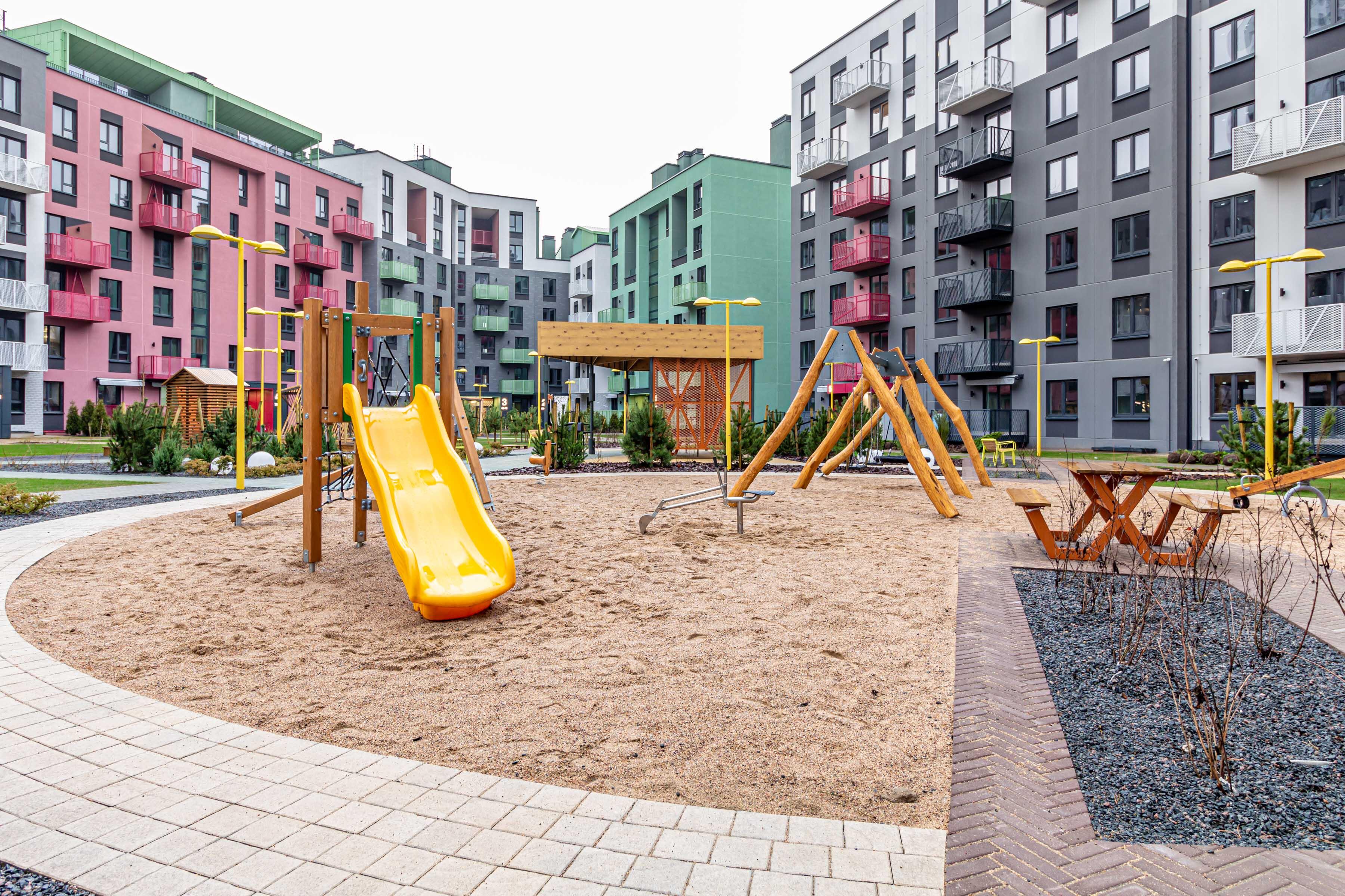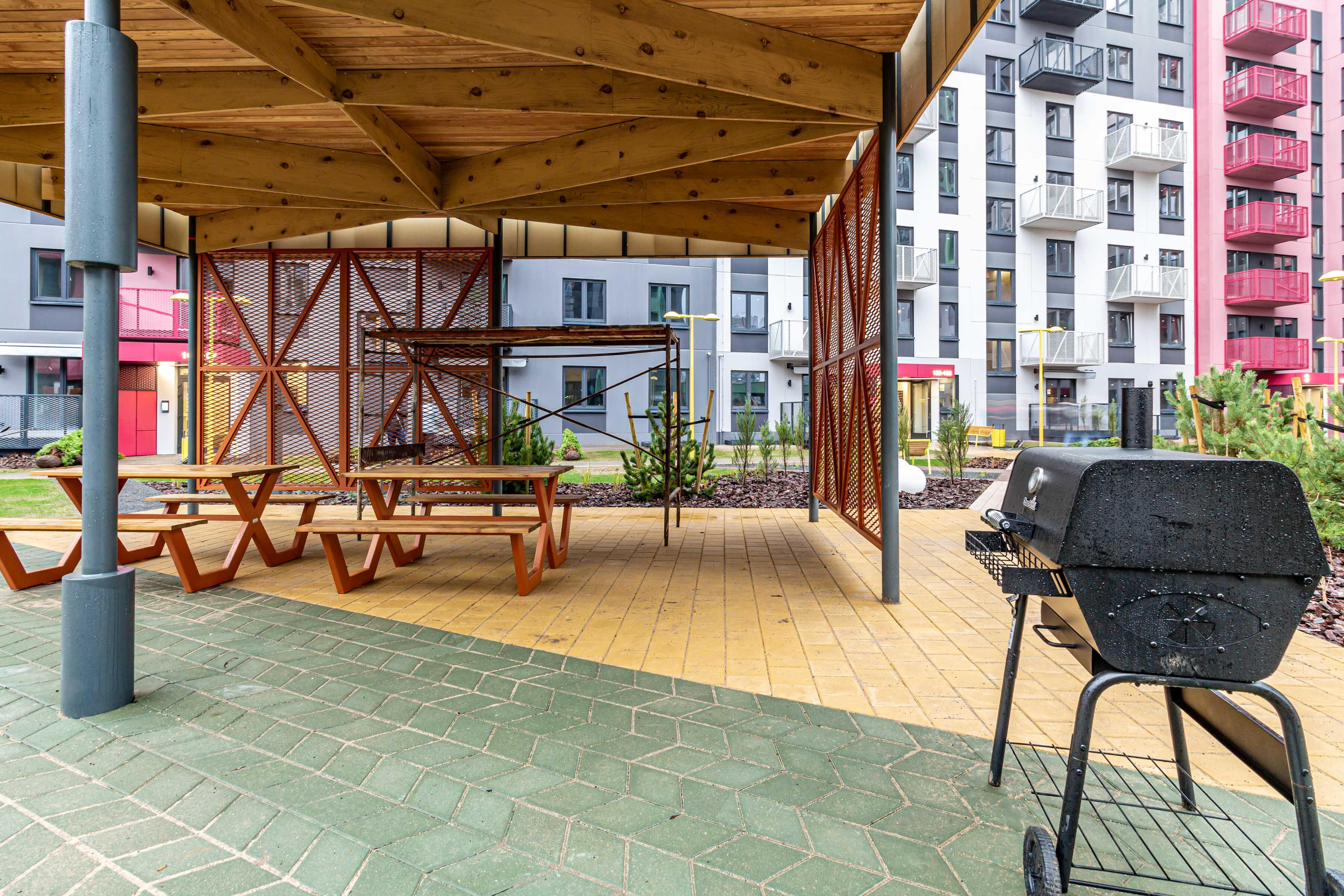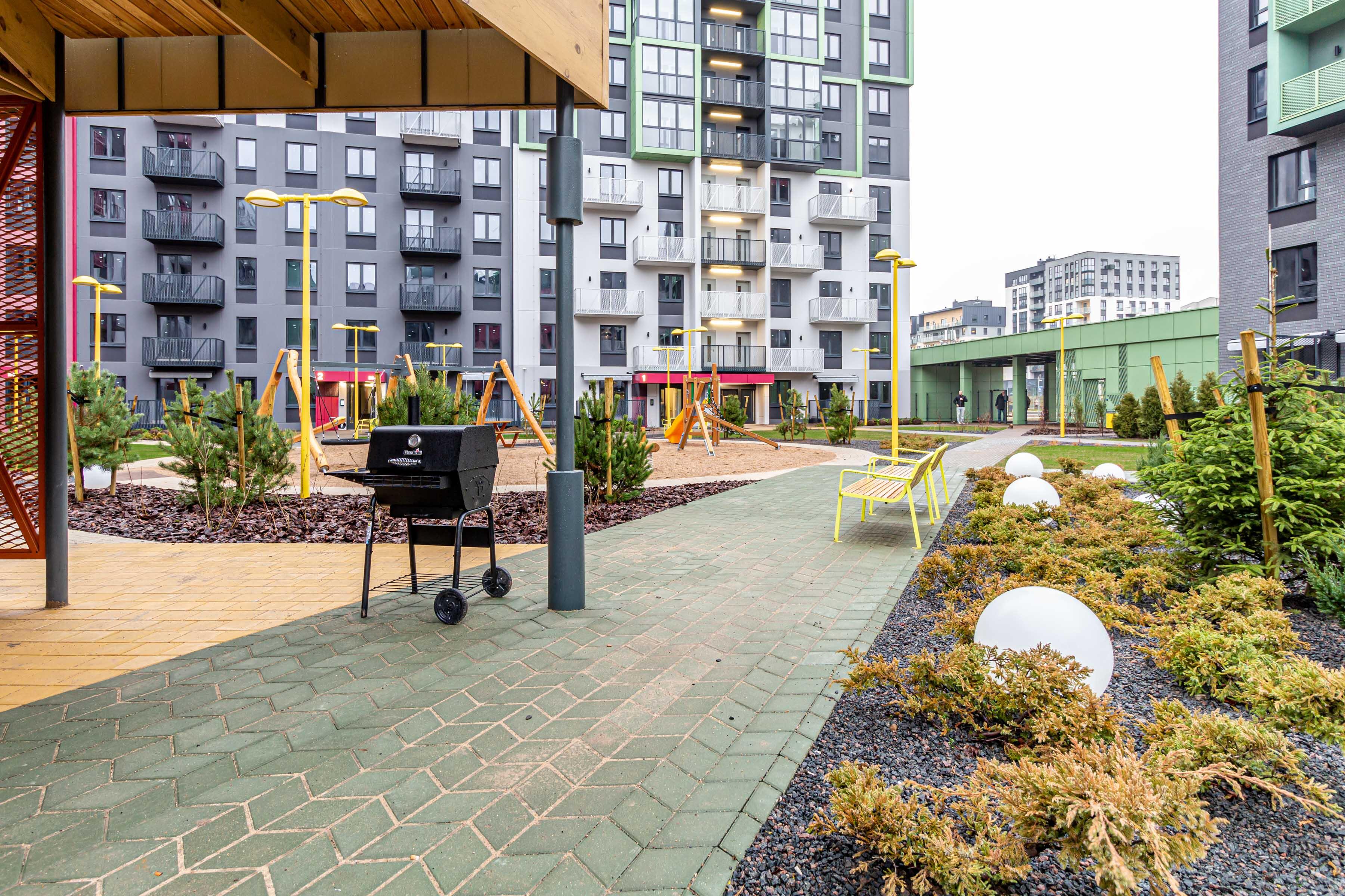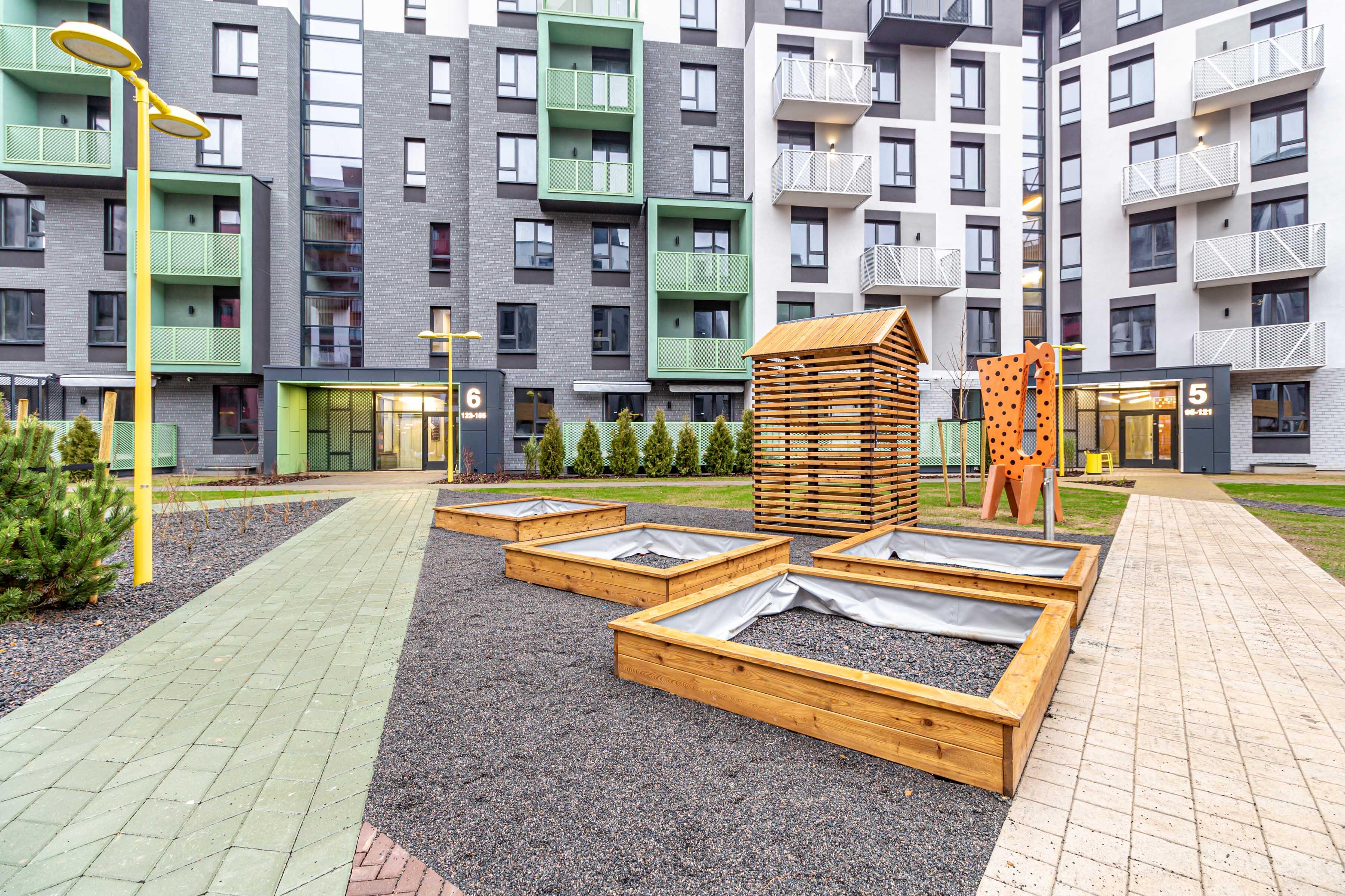Созданы уникальные стандарты организации придомовой территории: закрытая дворовая территория без автомобилей, велопарковки и круглосуточное видеонаблюдение. В пешей доступности множество мест для отдыха: кафе, магазины, спортивные и йога-студии, коворкинги, а также школа и детский сад.