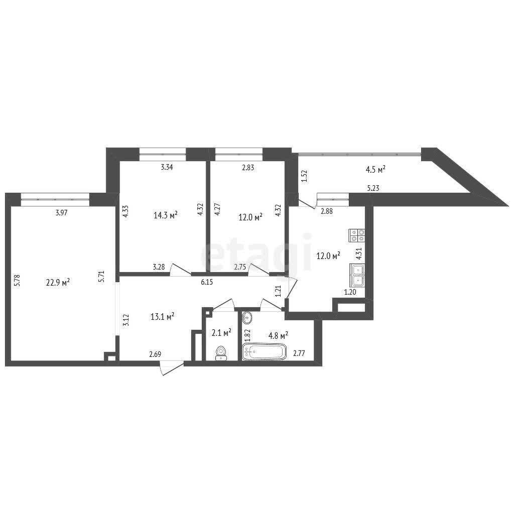 Удобная и практичная планировка без потери полезного пространства, 3 изолированные комнаты, просторная кухня 12м.кв.!