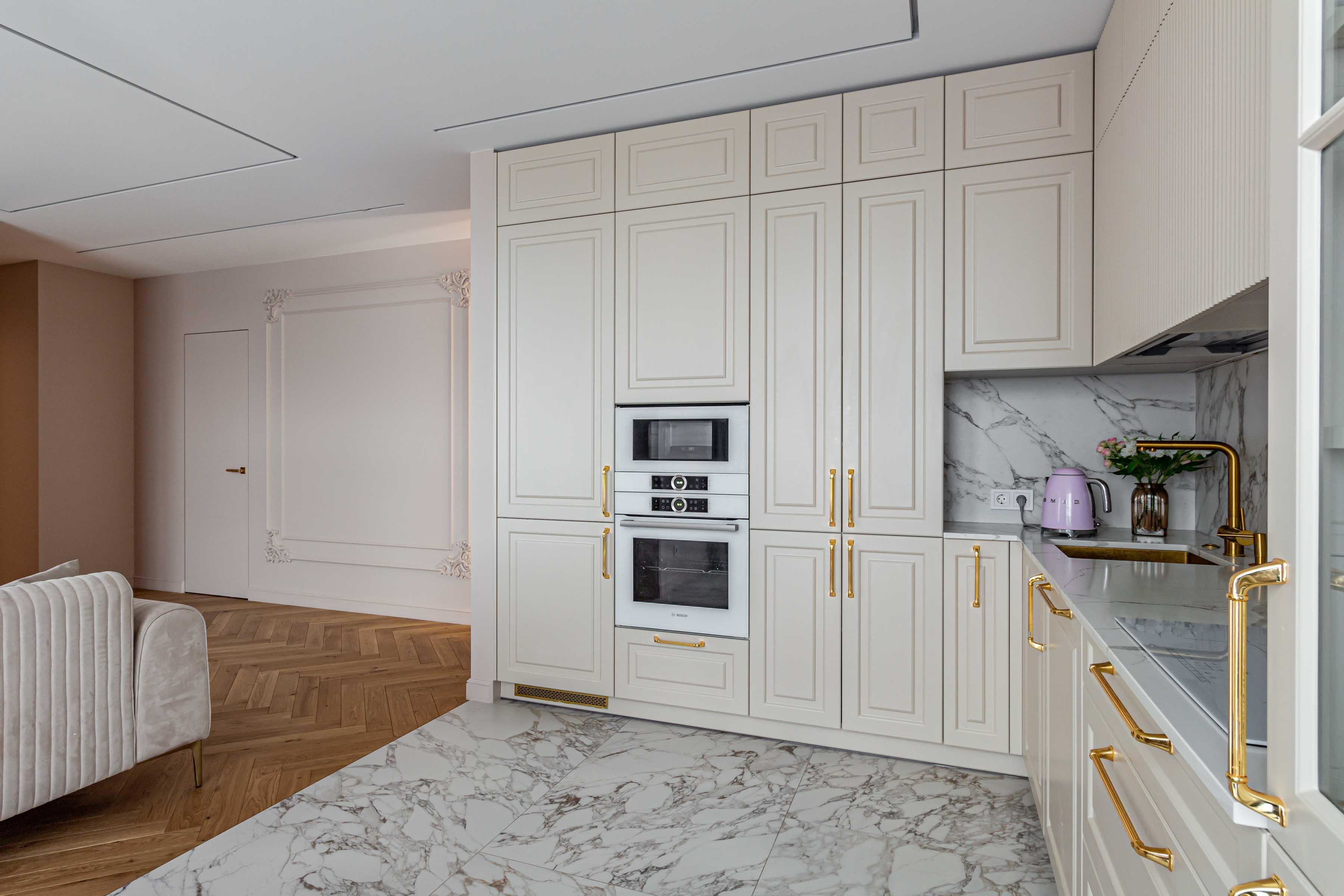 Кухня оснащена современной техникой : духовой шкаф, варочная панель и микроволновая печь, посудомоечная машина от производителя Bosch.