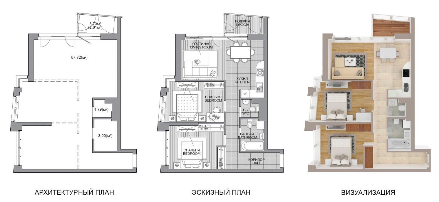 Жилая площадь 57.72 м²