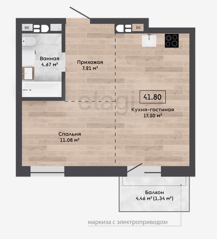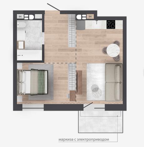 современная планировка «евроформата»: просторная кухня-гостиная + отдельная спальня;