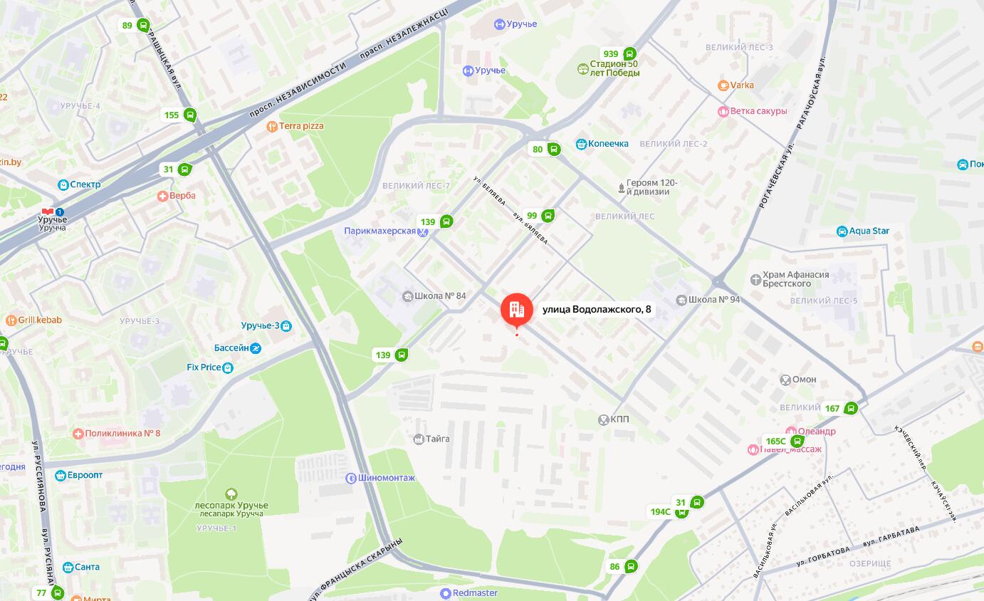 До метро Уручье — 3 остановки, автобусы: 99, 80, 139, 939, маршрутки: 1455, 1002.