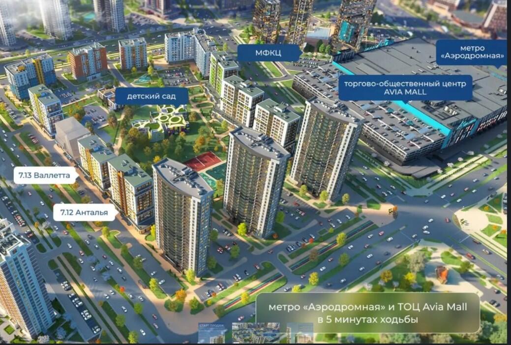 Зеленая парковая зона, международный финансовый центр и крупнейший торговый центр Авиа Молл в центре комплекса.