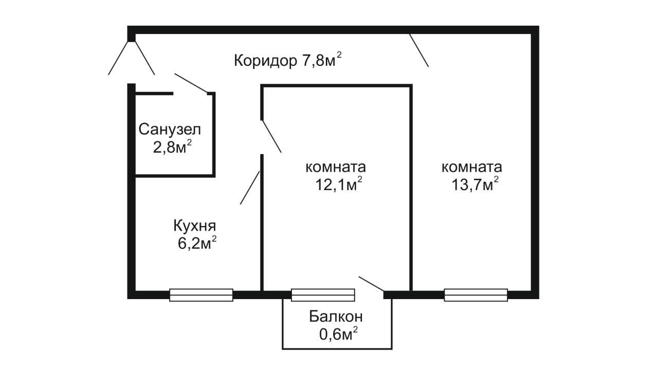44,3м2 - 1/2 (комната 13.7м2 без балкона)