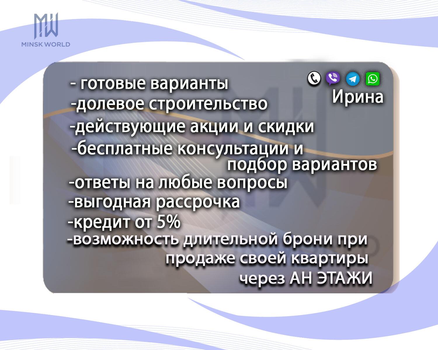 Апартаменты напрямую от застройщика! Дом Эверест! Старт продаж! Выбор планировок и этажей! Расчет рассрочки. Выгодная рассрочка! Цены и наличие актуальны на 11.01.2026. Стать владельцем недвижимости в Minsk World можно: За собственные средства. В рассрочку без справок и поручителей (только паспорт!). Все дома в комплексе каркасно-блочные, от 10 до 25 этажей. Скоростные бесшумные лифты...