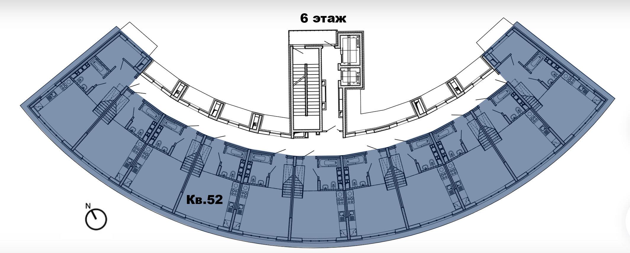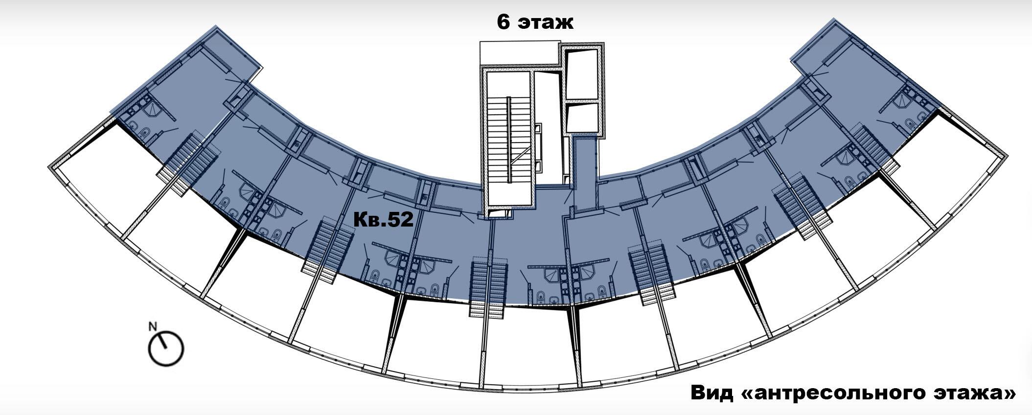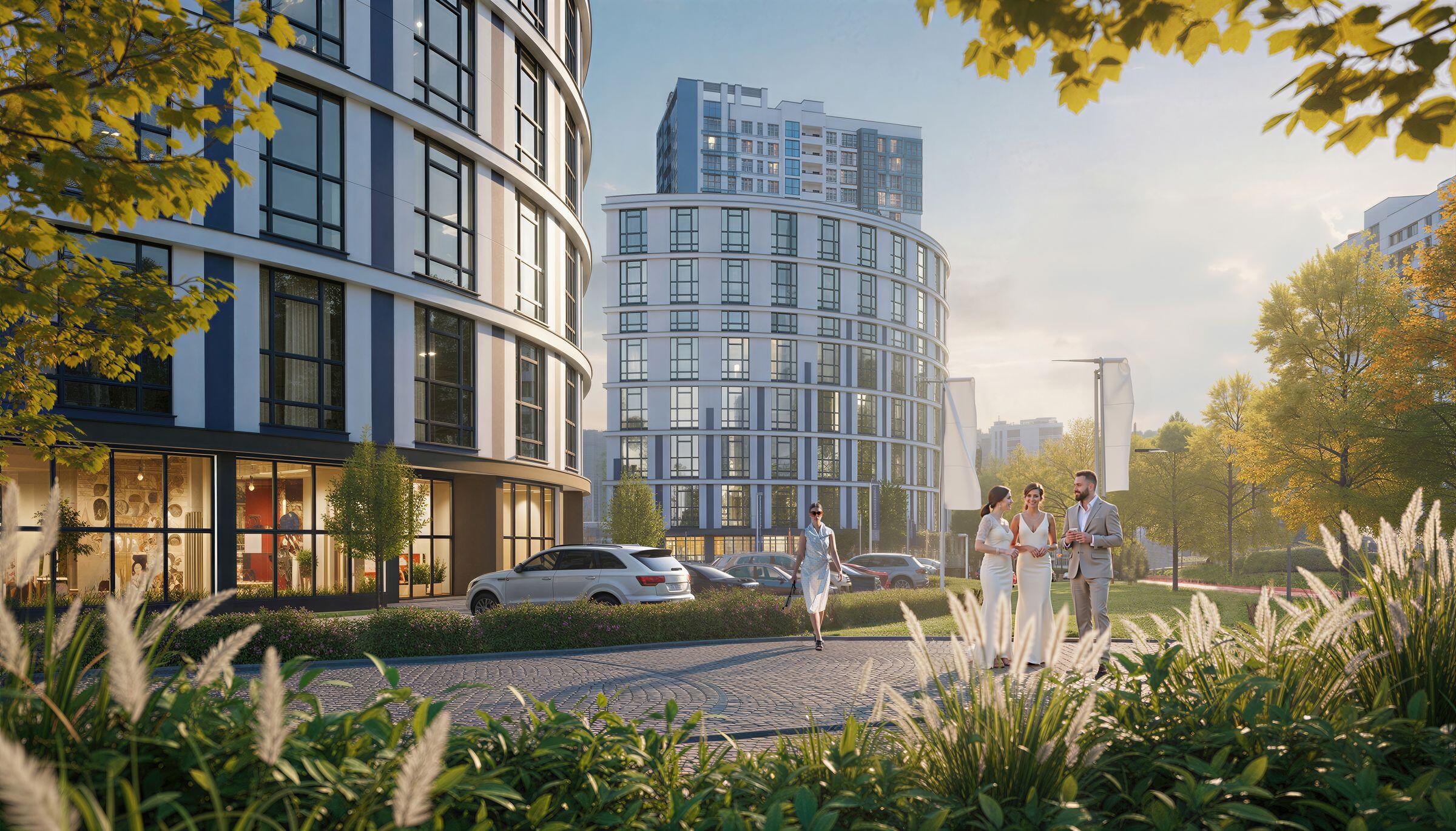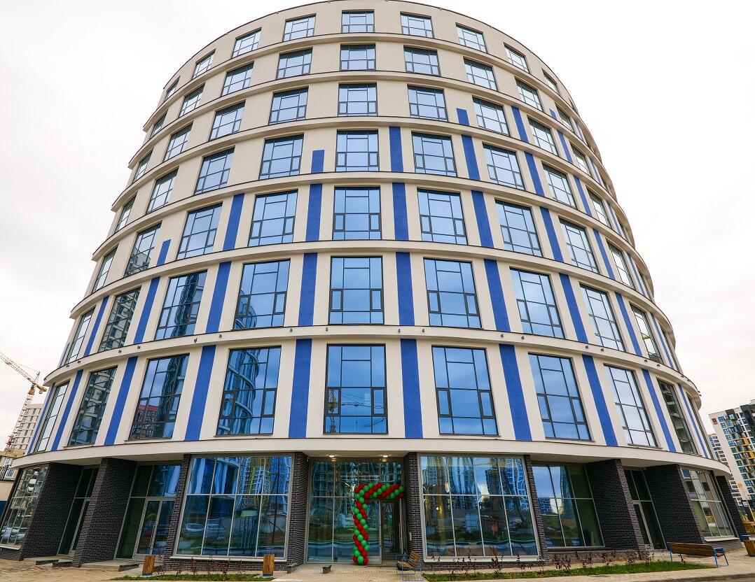 8 этажей. Всего 77 эксклюзивных квартир. Дугообразная архитектура, панорамное остекление 4,4 × 3 м. Фасад в бело-синих «природных» оттенках. Безбарьерные входы, предусмотрены пандусы.