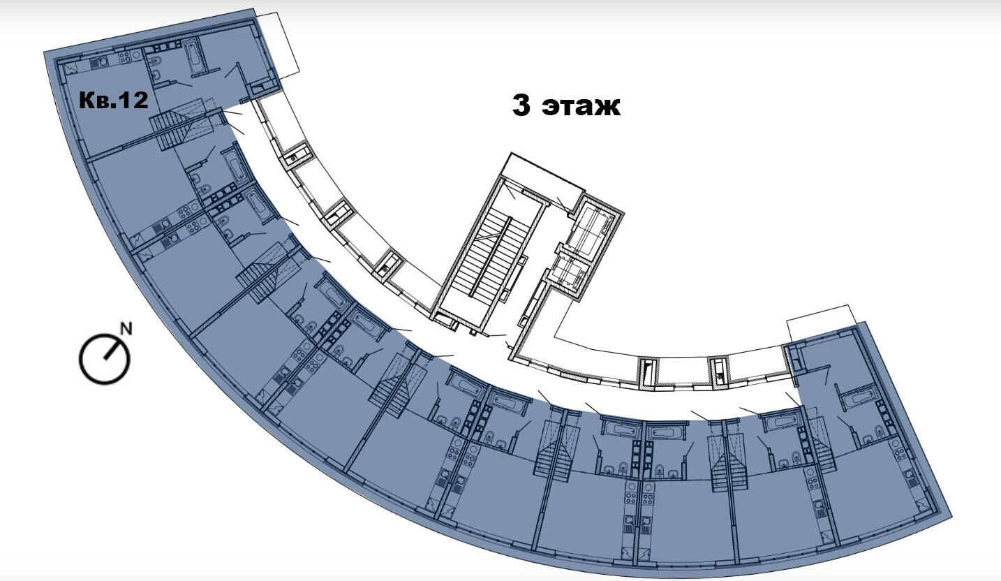 8 этажей. Всего 77 эксклюзивных квартир. Дугообразная архитектура, панорамное остекление 4,4 × 3 м. Фасад в бело-синих «природных» оттенках. Безбарьерные входы, предусмотрены пандусы.