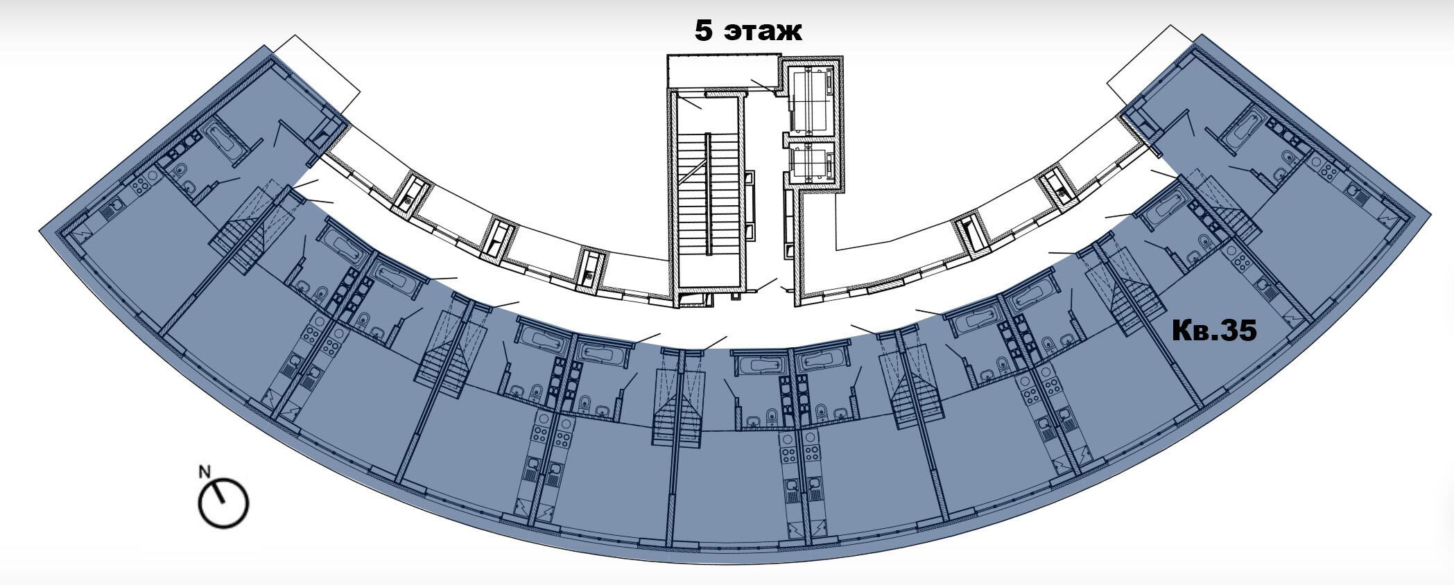 8 этажей. Всего 77 эксклюзивных квартир. Дугообразная архитектура, панорамное остекление 4,4 × 3 м. Фасад в бело-синих «природных» оттенках. Безбарьерные входы, предусмотрены пандусы.