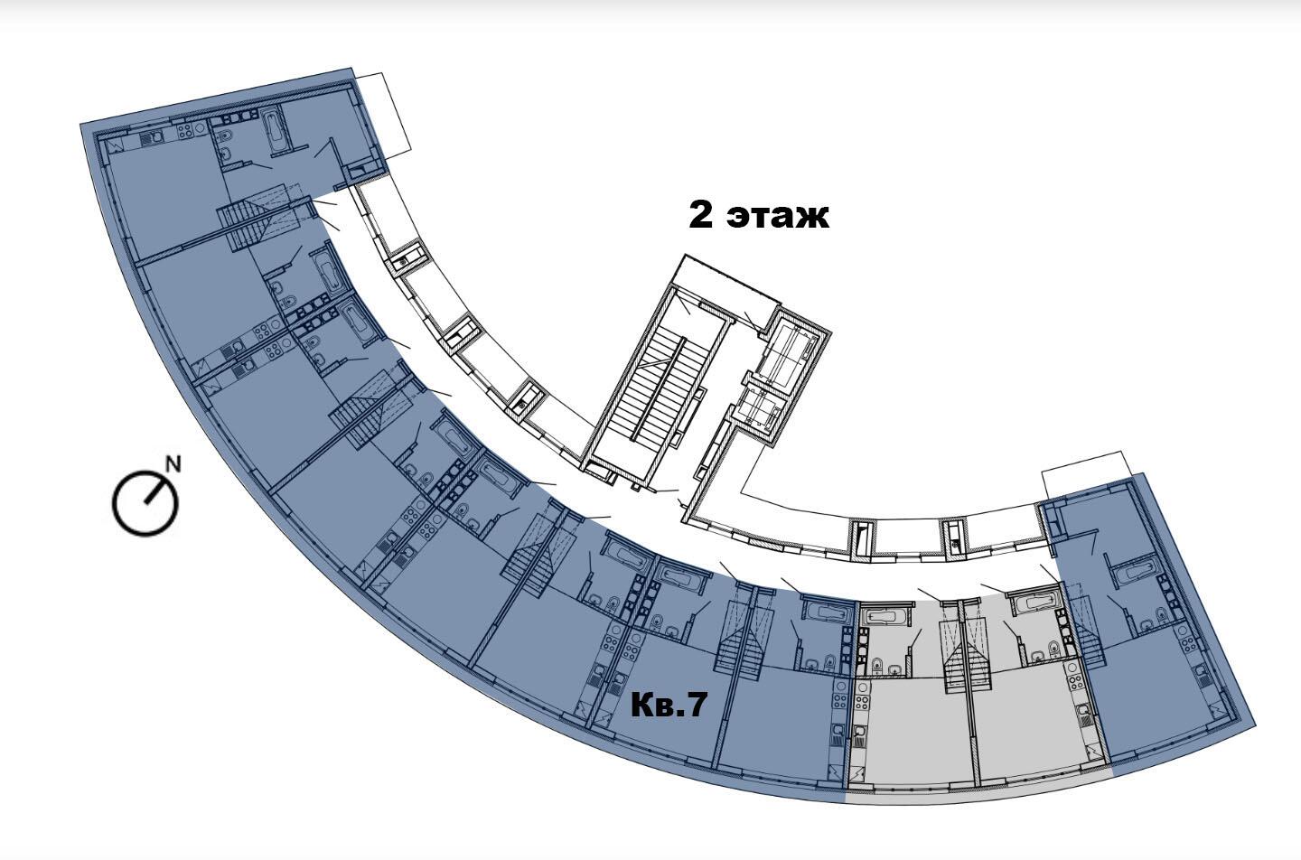 8 этажей. Всего 77 эксклюзивных квартир. Дугообразная архитектура, панорамное остекление 4,4 × 3 м. Фасад в бело-синих «природных» оттенках. Безбарьерные входы, предусмотрены пандусы.