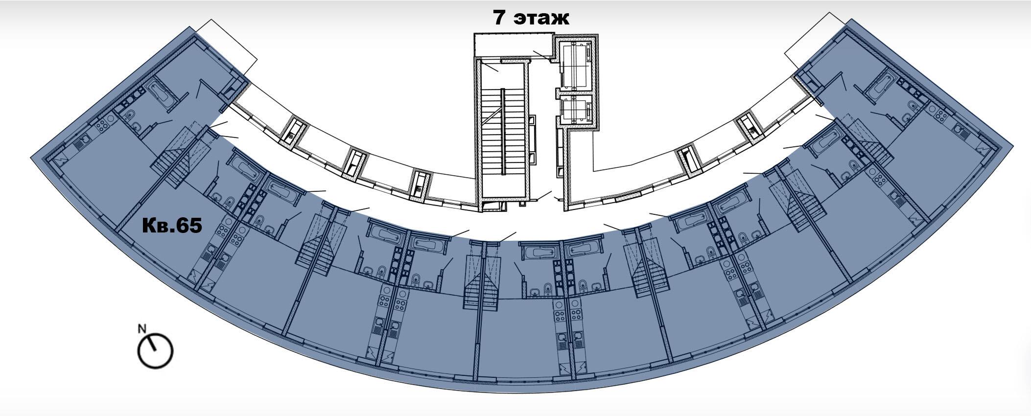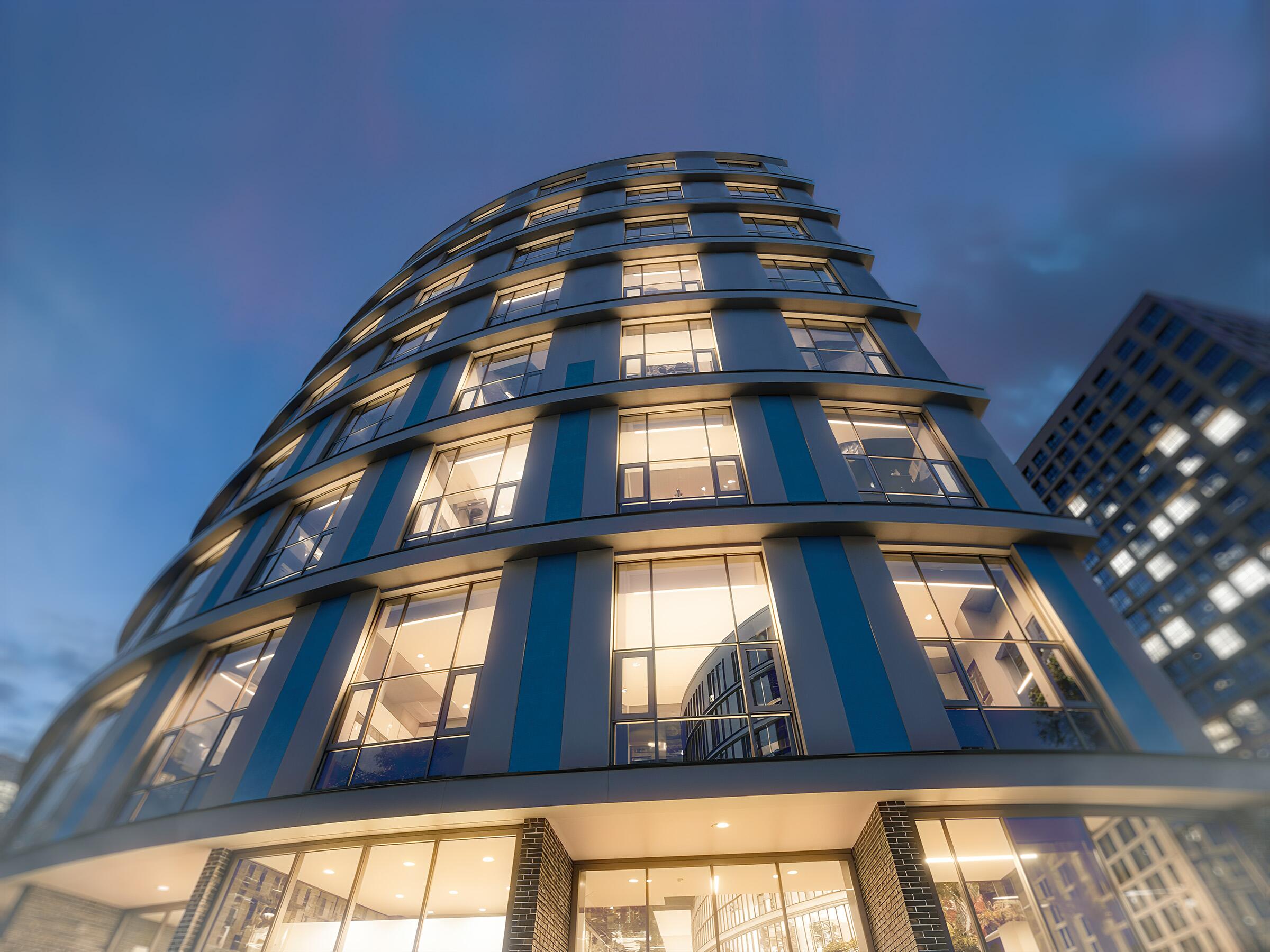 8 этажей. Всего 77 эксклюзивных квартир. Дугообразная архитектура, панорамное остекление 4,4 × 3 м. Фасад в бело-синих «природных» оттенках. Безбарьерные входы, предусмотрены пандусы.