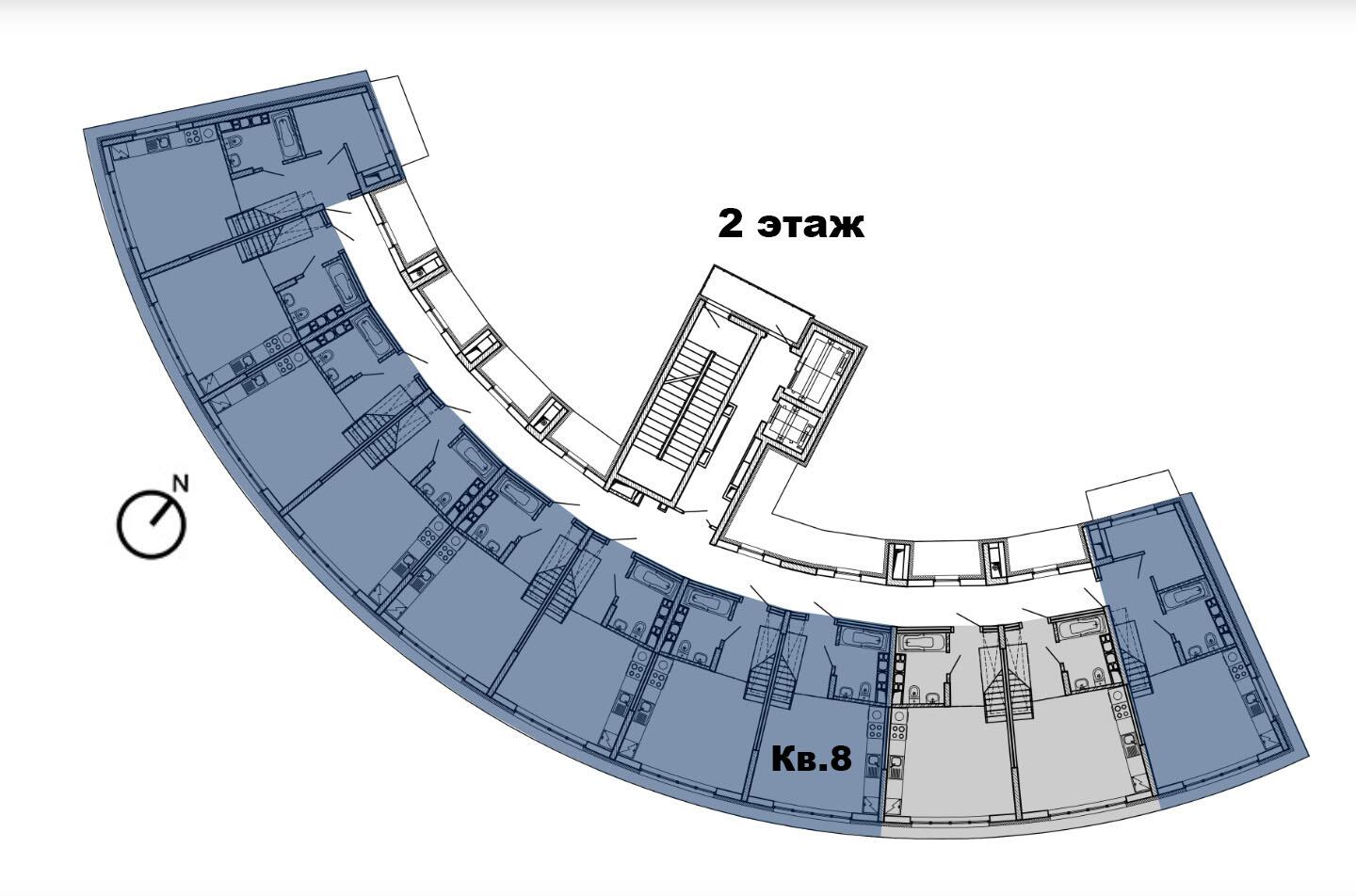 8 этажей. Всего 77 эксклюзивных квартир. Дугообразная архитектура, панорамное остекление 4,4 × 3 м. Фасад в бело-синих «природных» оттенках. Безбарьерные входы, предусмотрены пандусы.