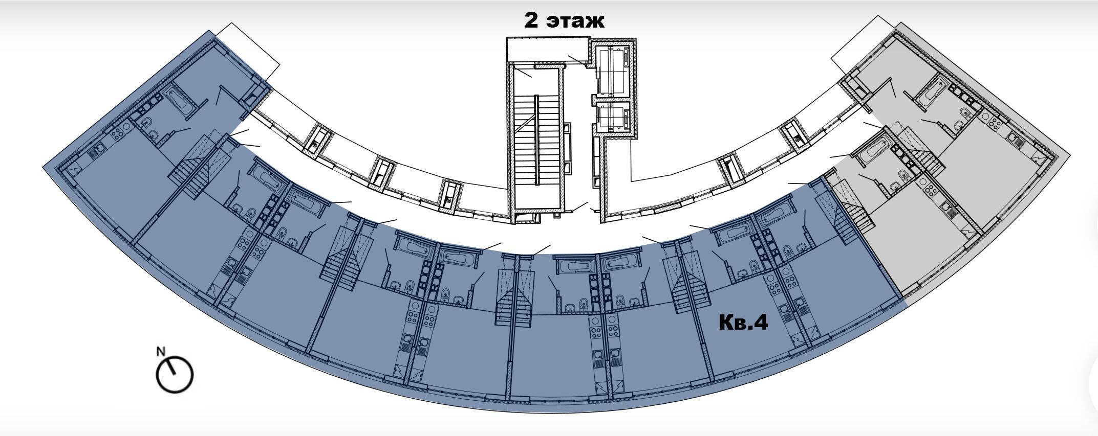 8 этажей. Всего 77 эксклюзивных квартир. Дугообразная архитектура, панорамное остекление 4,4 × 3 м. Фасад в бело-синих «природных» оттенках. Безбарьерные входы, предусмотрены пандусы.