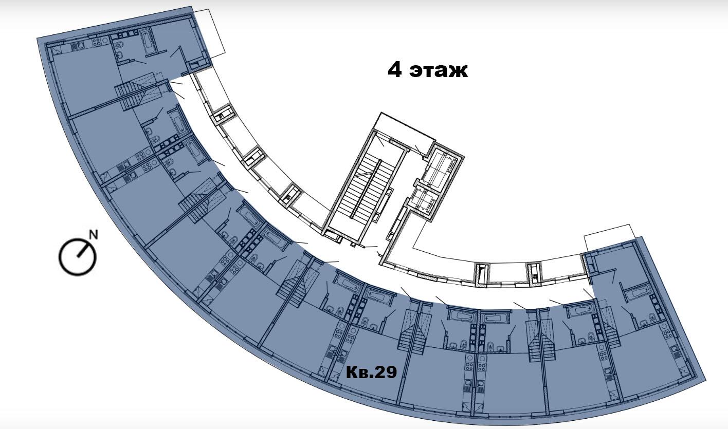 8 этажей. Всего 77 эксклюзивных квартир. Дугообразная архитектура, панорамное остекление 4,4 × 3 м. Фасад в бело-синих «природных» оттенках. Безбарьерные входы, предусмотрены пандусы.
