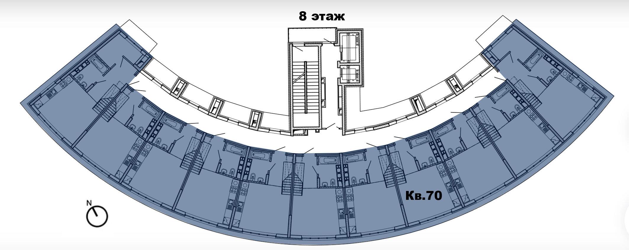 8 этажей. Всего 77 эксклюзивных квартир. Дугообразная архитектура, панорамное остекление 4,4 × 3 м. Фасад в бело-синих «природных» оттенках. Безбарьерные входы, предусмотрены пандусы.