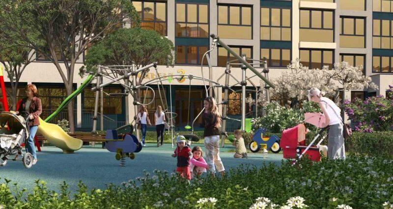 В квартале запроектирован детский сад на 270 человек, торгово-общественный центр, площадки для игр детей, территории воркаута и спортплощадки для здорового отдыха и поддержания физической формы.Парковочные места удалены от мест игр детей