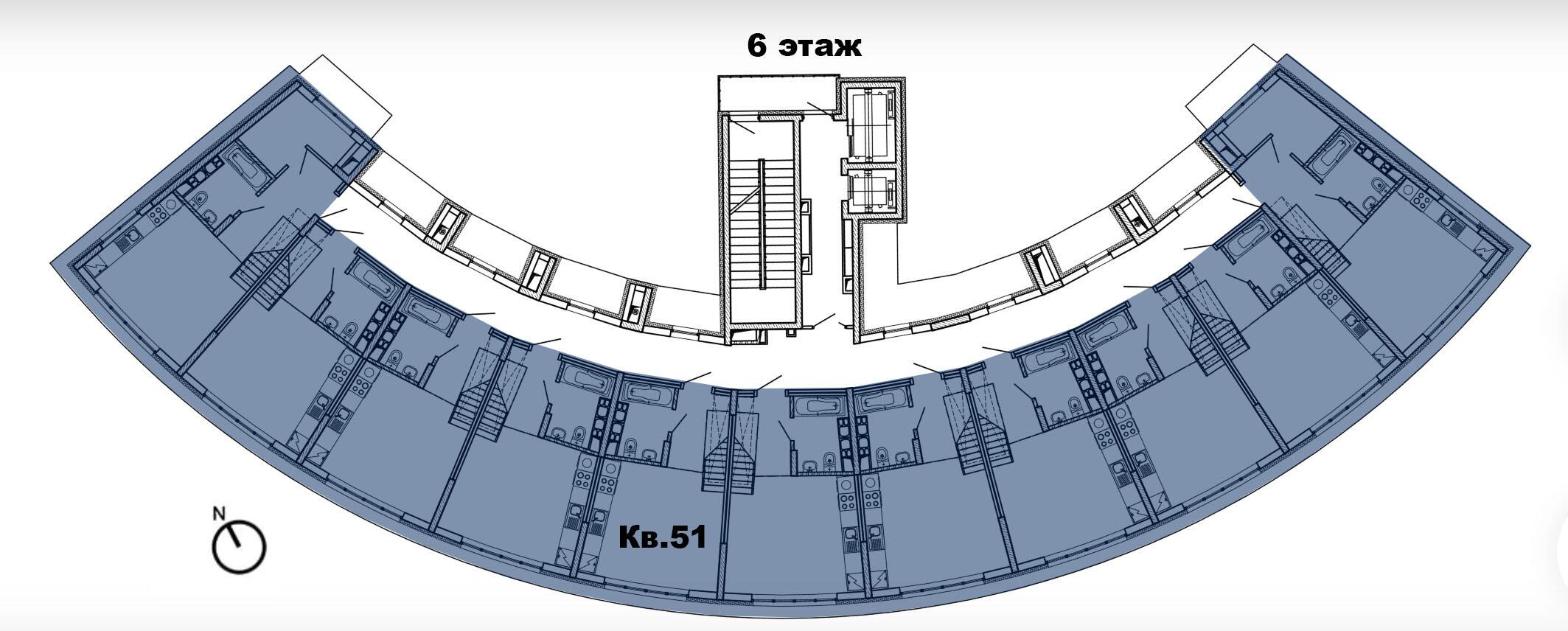 8 этажей. Всего 77 эксклюзивных квартир. Дугообразная архитектура, панорамное остекление 4,4 × 3 м. Фасад в бело-синих «природных» оттенках. Безбарьерные входы, предусмотрены пандусы.
